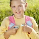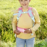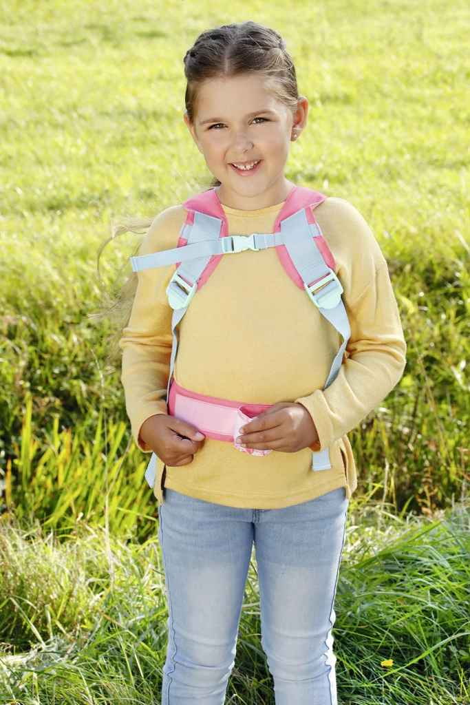 Mehko oblazinjeni trakovi, prsna zaponka in ledveni pas zagotavljajo stabilnost, medtem ko se nastavljive zaponke zlahka prilagodijo postavi otroka. Nežni cvetlični in parkovni motivi z kačjimi pastirji in lokvanji dajejo dodatku čaroben videz, ki spodbuja domišljijo.