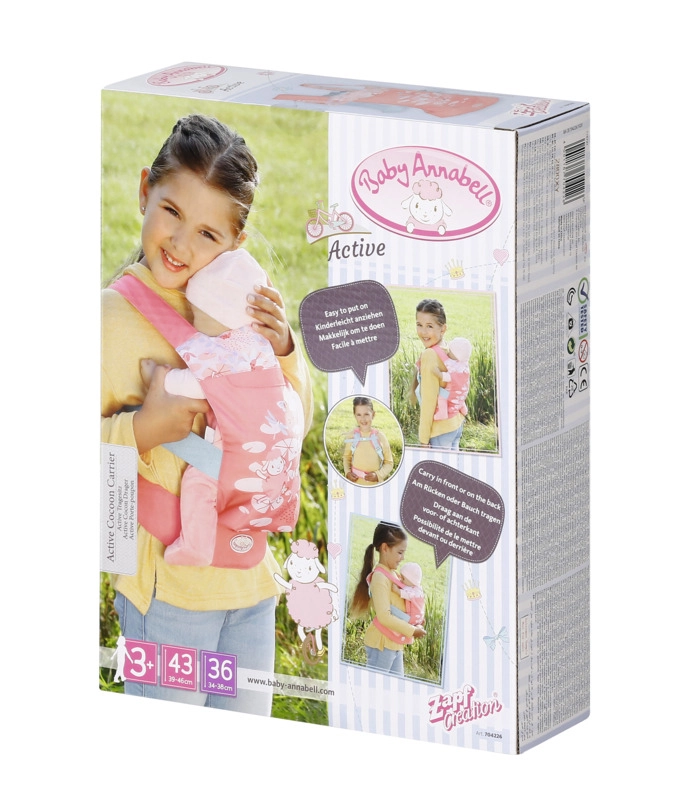 Omogočite otrokom, da svojo najljubšo punčko BABY ANNABELL nosijo udobno in varno. Ta nosilka ponuja nošenje spredaj in na hrbtu, ima dva sprednja sedeča položaja in nastavljiv sistem trakov za različne velikosti otrok. Mehka tekstilna izvedba z prisrčnimi potiski spodbuja domišljijo in igro vlog doma in na prostem.