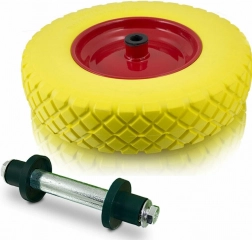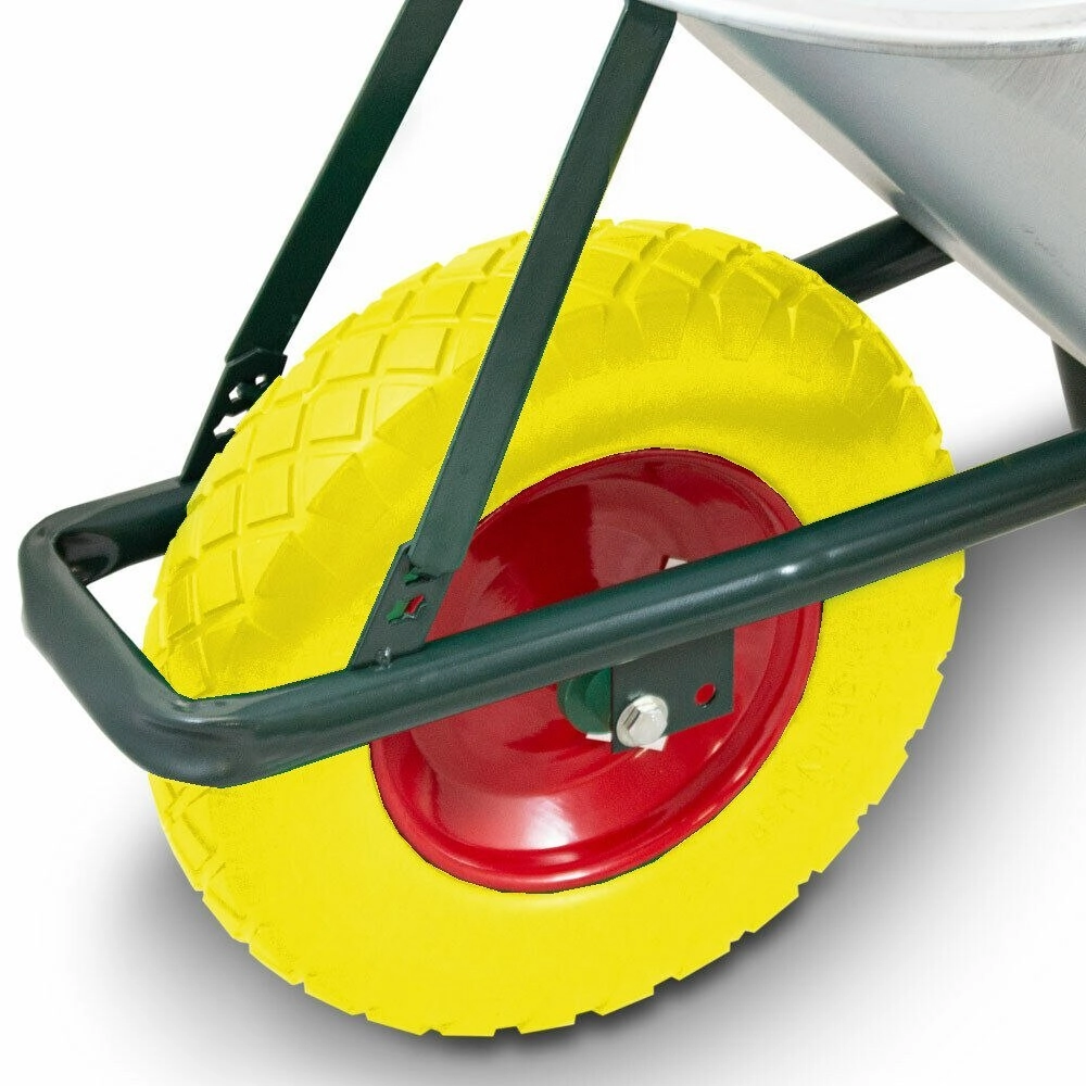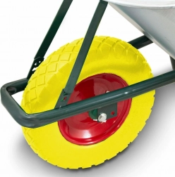 Polno poliuretansko (PU) kolo z igličnim ležajem ne zahteva napihovanja, je odporno proti predrtjem in zagotavlja gladko ter stabilno vožnjo po terenu. Dolgi ergonomski ročaji olajšajo rokovanje in zmanjšujejo utrujenost pri delu.