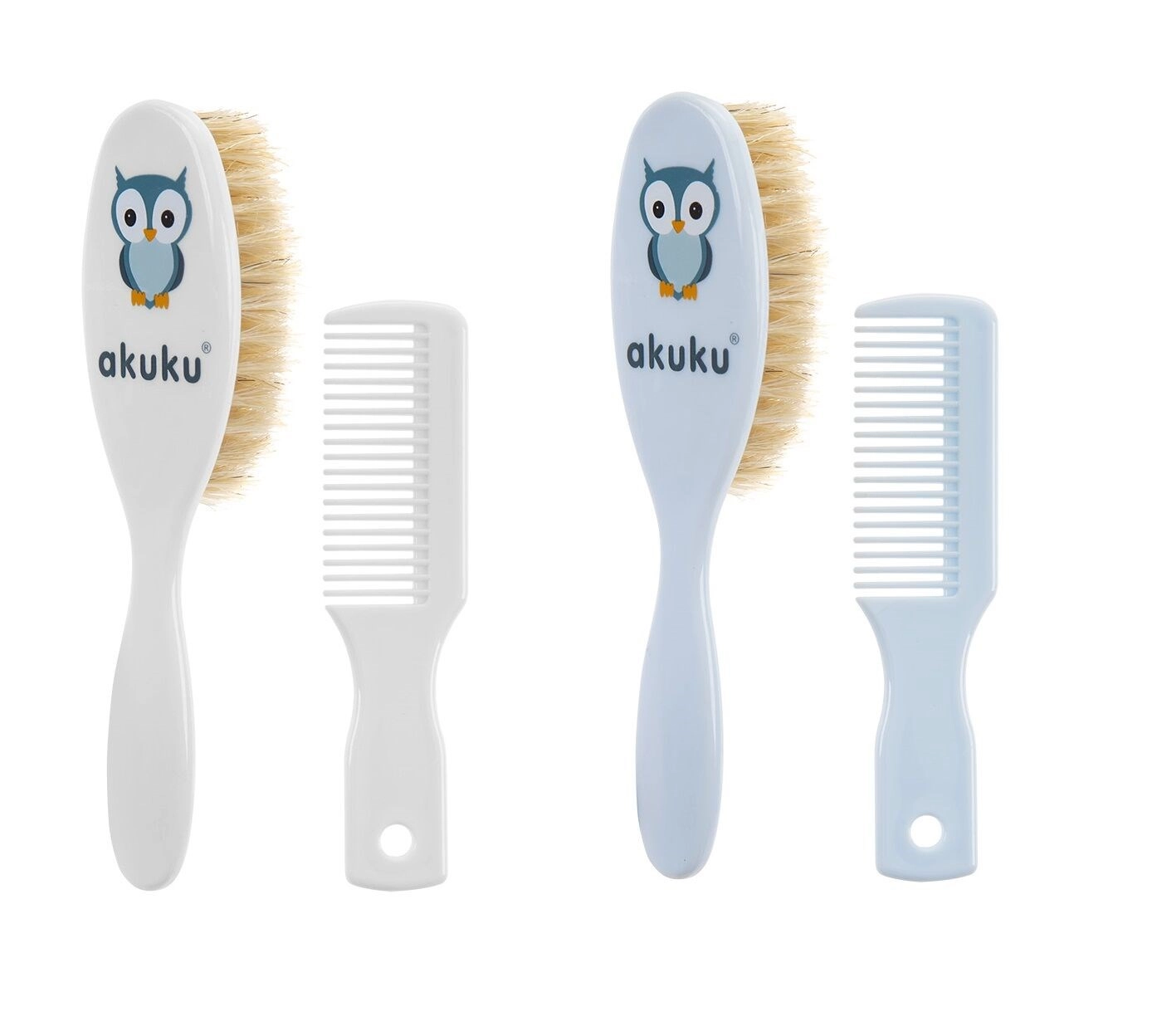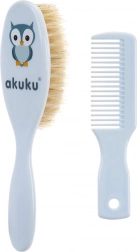 Set krtačke in glavnika AKUKU je zasnovan za najnežnejšo nego otroških las. Naravne ščetine krtačke so mehke, prijazne do kože in pomagajo zmanjševati statično elektriko. Glavnik z nežnimi zobmi dopolnjuje vsakodnevno urejanje pričeske.