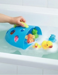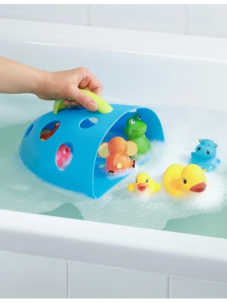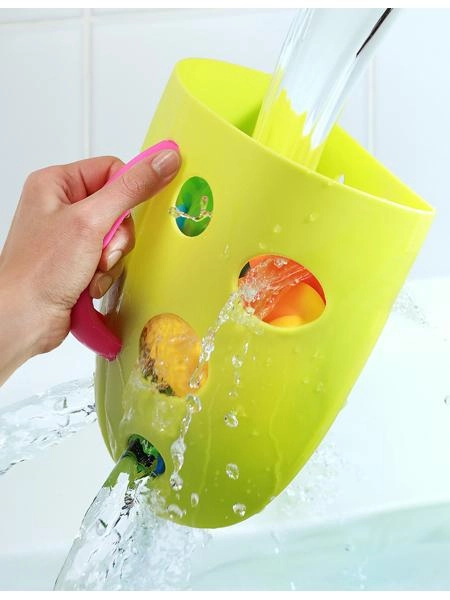 Vgrajen ročaj omogoča udobno dvigovanje košare iz nosilca in prenašanje igrač na mesto, kjer se lahko dosušijo.