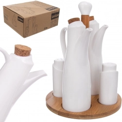 Eleganten porcelanast namizni komplet z vrtljivim bambusovim stojalom poskrbi, da imate začimbe in dodatke pregledno pri roki. Vsebuje steklenici za olje in kis, solnico in popernico. Porcelanaste posode so trpežne in enostavne za čiščenje, bambusovo stojalo zagotavlja stabilnost in slog, plutasti zamaški ohranjajo svežino olja in kisa, praktične dimenzije pa se podajo na vsako mizo.