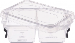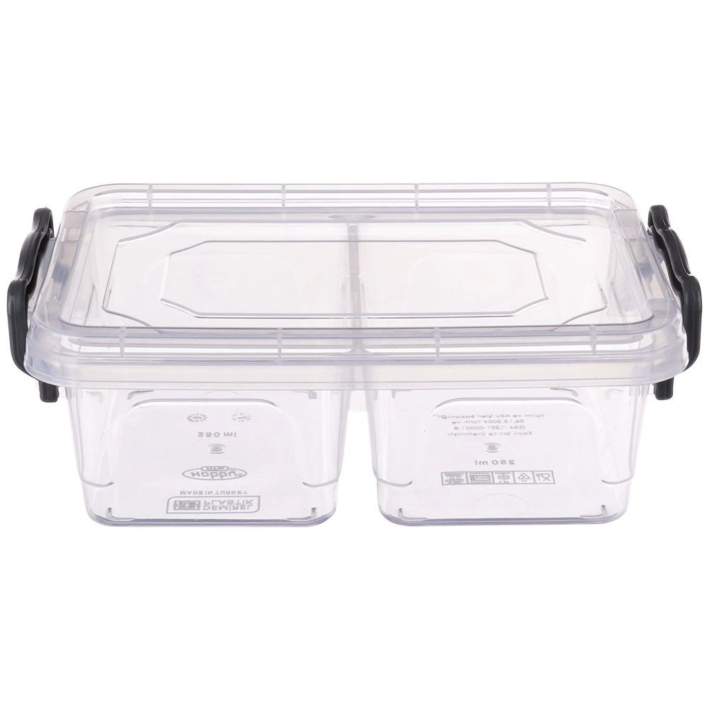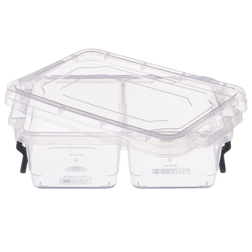 Prozoren vsebnik za živila s prostornino 500 ml omogoča, da imate prigrizke in priloge pregledno ločene zahvaljujoč 2 ločenima pregradama. Trdne zapiralne sponke ohranjajo vsebino svežo in zmanjšujejo tveganje razlivanja. Zaradi prozorne izvedbe imate vedno pregled nad vsebino.