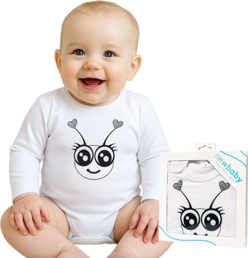 Ljubek dojenjski bodi z dolgimi rokavi NEW BABY v motivu pikapolonice navduši z živahnimi barvami in udobnim krojem. Ima mehke elastične obrobe na rokavih, praktično zapenjanje z neti na ramenih in med nožicami ter je sešit iz 100% bombaža za celodnevno udobje. Tisk je varen in certificiran za dojenčke, zato lahko uživate v izvirnem videzu brez kompromisov.