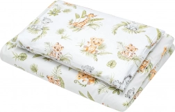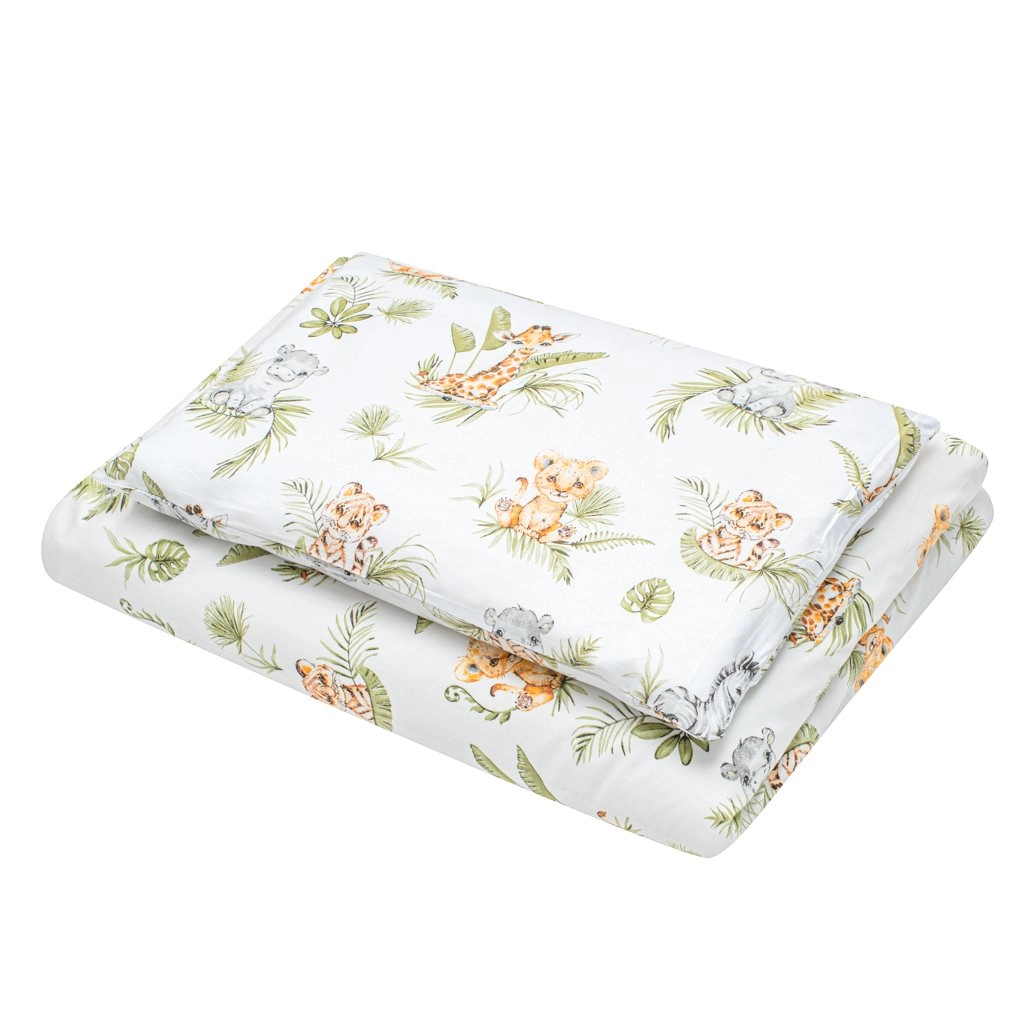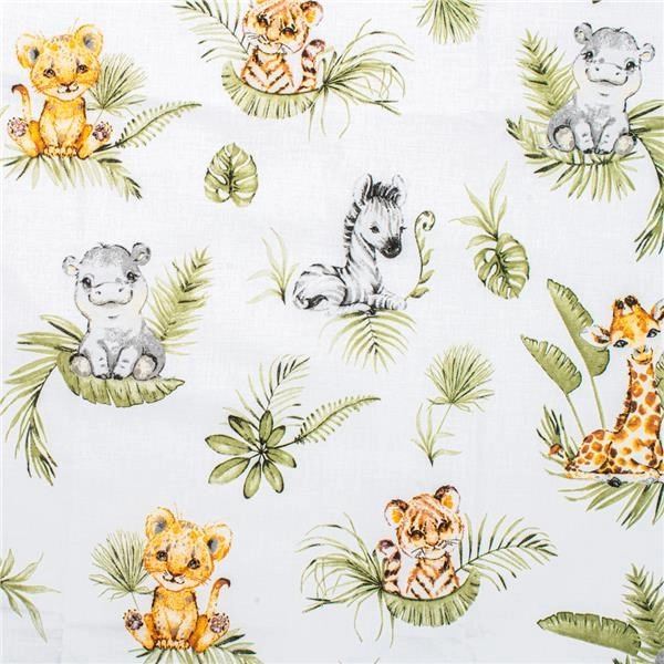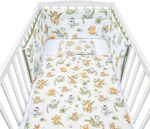 Privoščite otroški sobici mehkobo in šarm s posteljnino NEW BABY Jungle. Kakoviten bombažni satenski jersey (100% bombaž) je zračen, prijeten na dotik in nežen do občutljive kože. Praktična obroba (mantinel) ščiti dojenčka pred udarci ob rešetke posteljice in ustvarja udobno okolje za spanje.