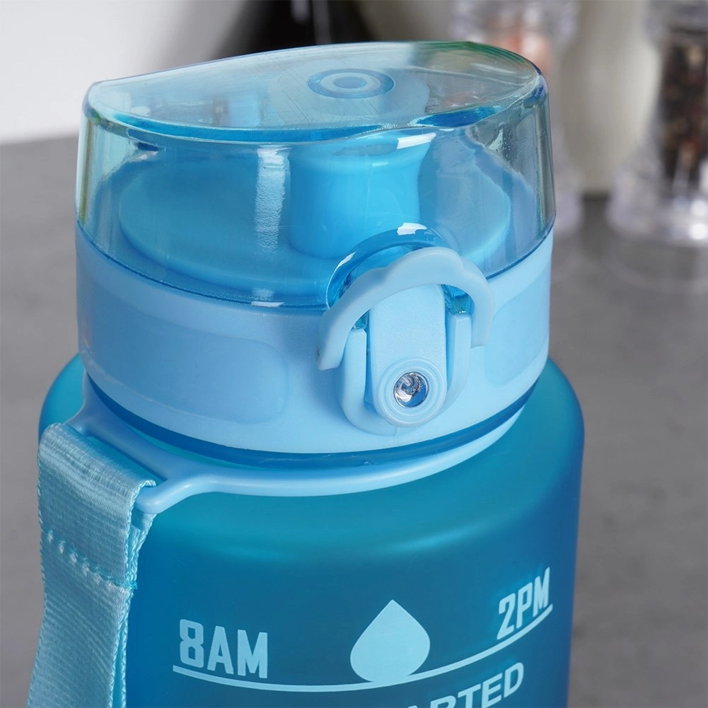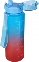 Praktična športna steklenica s prostornino 1 l v ombre dizajnu modre in rdeče vas ohranja hidrirane ves dan. Ima časovne oznake in motivacijske napise, merilno lestvico v ml in fl oz, tesen pokrovček na preklop z varovalom in udoben ustnik za upravljanje z eno roko. Lahka, vzdržljiva in z paščkom za enostavno nošenje za šport, v službo in na izlete.