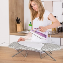 Kompaktna namizna likalna deska za majhna stanovanja, študentske domove in potovanja ponuja stabilno kovinsko konstrukcijo, nedrseče nogice ter udobno bombažno prevleko s filcno podlogo. Ima izvlečni nosilec za likalnik, enostavno se razpre in po zlaganju zavzame minimalno prostora.