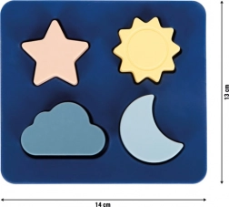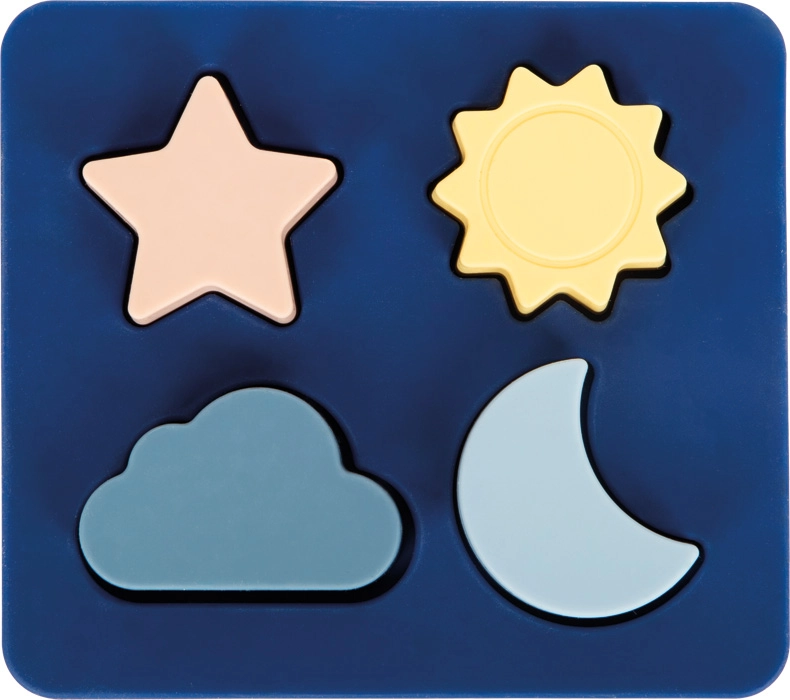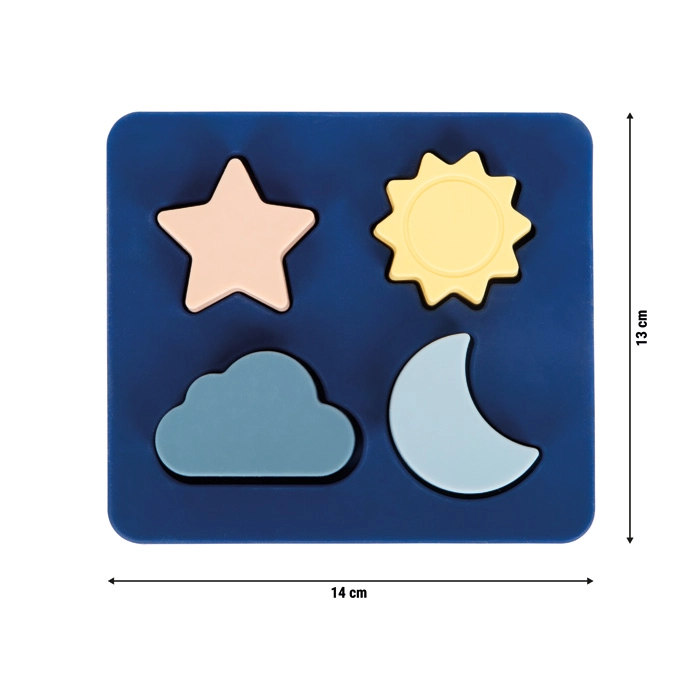 Prisrčna otroška sestavljanka iz 100 % živilsko varnega silikona brez BPA prinaša varno in zabavno učenje za najmlajše. Vsebuje 4 koščke v obliki sonca, lune, zvezde in oblačka, ki jih je mogoče vstavljati z različnih strani. Igrača je mehka, nezlomljiva, netoksična, enostavna za čiščenje in idealna za igro doma, v vodi in v pesku – popolna za na poti ter za razvoj fine motorike in senzoričnega zaznavanja.