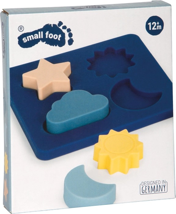 Silikonska sestavljanka small foot je zasnovana za majhne rokice in radovedne glavice. Štiri pastelne oblike – sonce, luna, zvezda in oblaček – lahko otroci zlahka primejo in vstavijo v podlago z različnih strani, kar spodbuja ustvarjalnost in naravno učenje oblik ter barv. Material iz živilsko varnega silikona brez BPA je na otip nežen, brez vonja in popolnoma varen tudi ob stiku z usti.