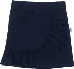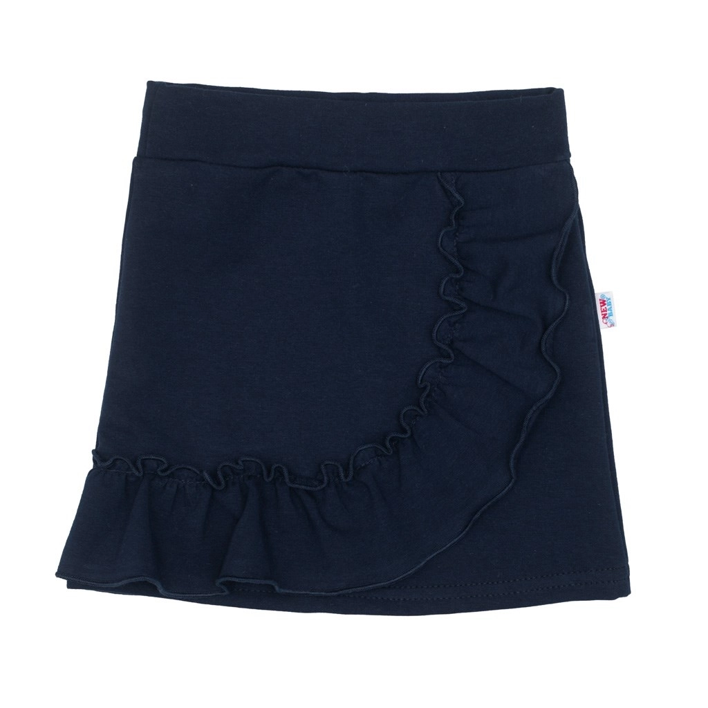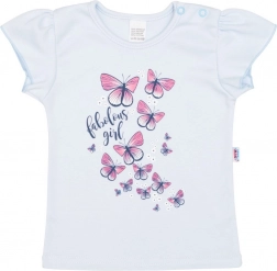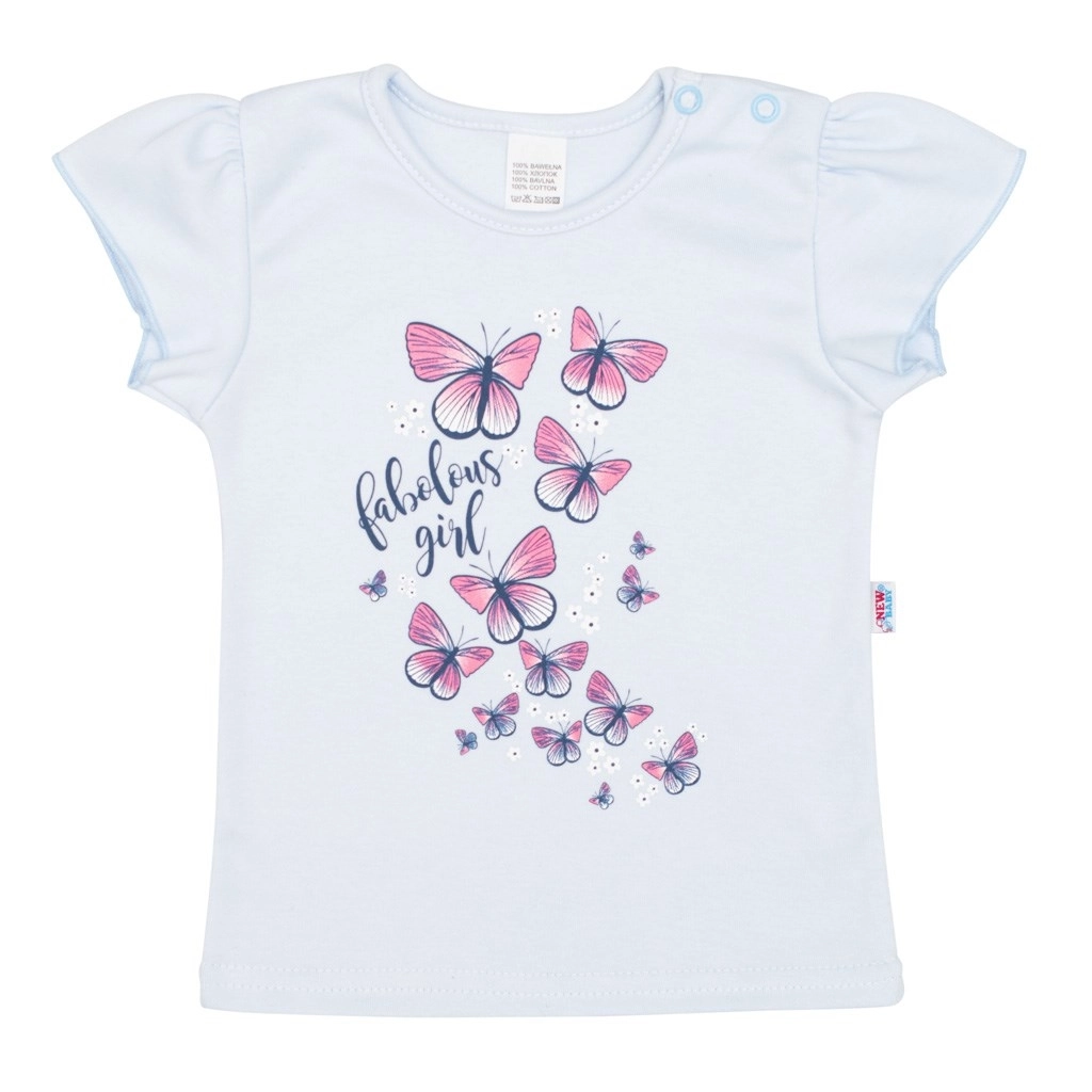 Ljubka 2-delna kompletka za deklice NEW BABY Butterflies vsebuje udobno majico in modno krilce. Majico s kratkimi nabranimi rokavčki krasi nežen potisk metuljev, na rami pa ima praktično zapenjanje na pritiskače za lažje oblačenje. Krilce v temno modri barvi ima čudovit volan in širši elastični pas, ki ne pritiska na trebušček. Material je mehak in zračen za največje udobje dojenčka.