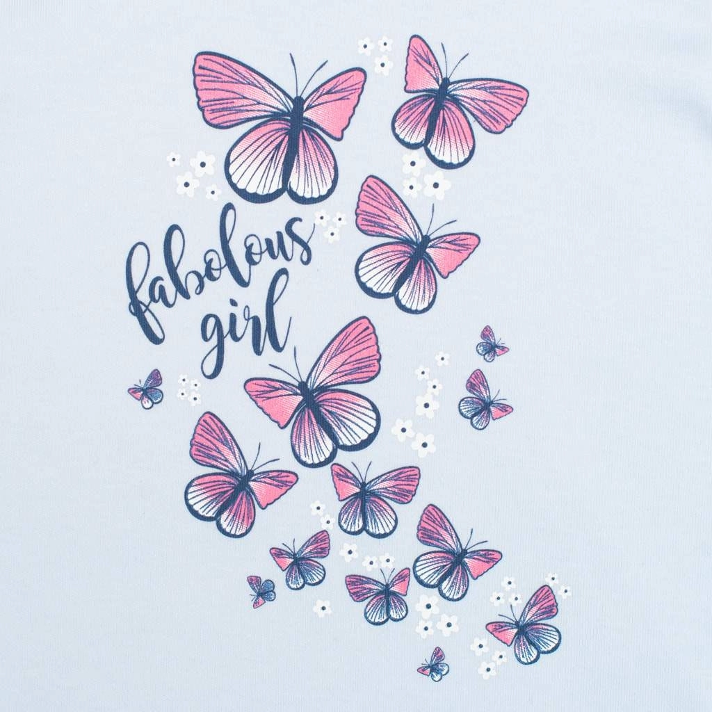 Krilce v elegantni temno modri barvi je okrašeno z šik volanom, ki celotnemu outfitu doda iskrico. Širši pas z elastiko je nežen in udoben, zato ne tišči in dobro stoji. Ljubek motiv metuljev na majici poudarja igriv dizajn za male lepotičke.