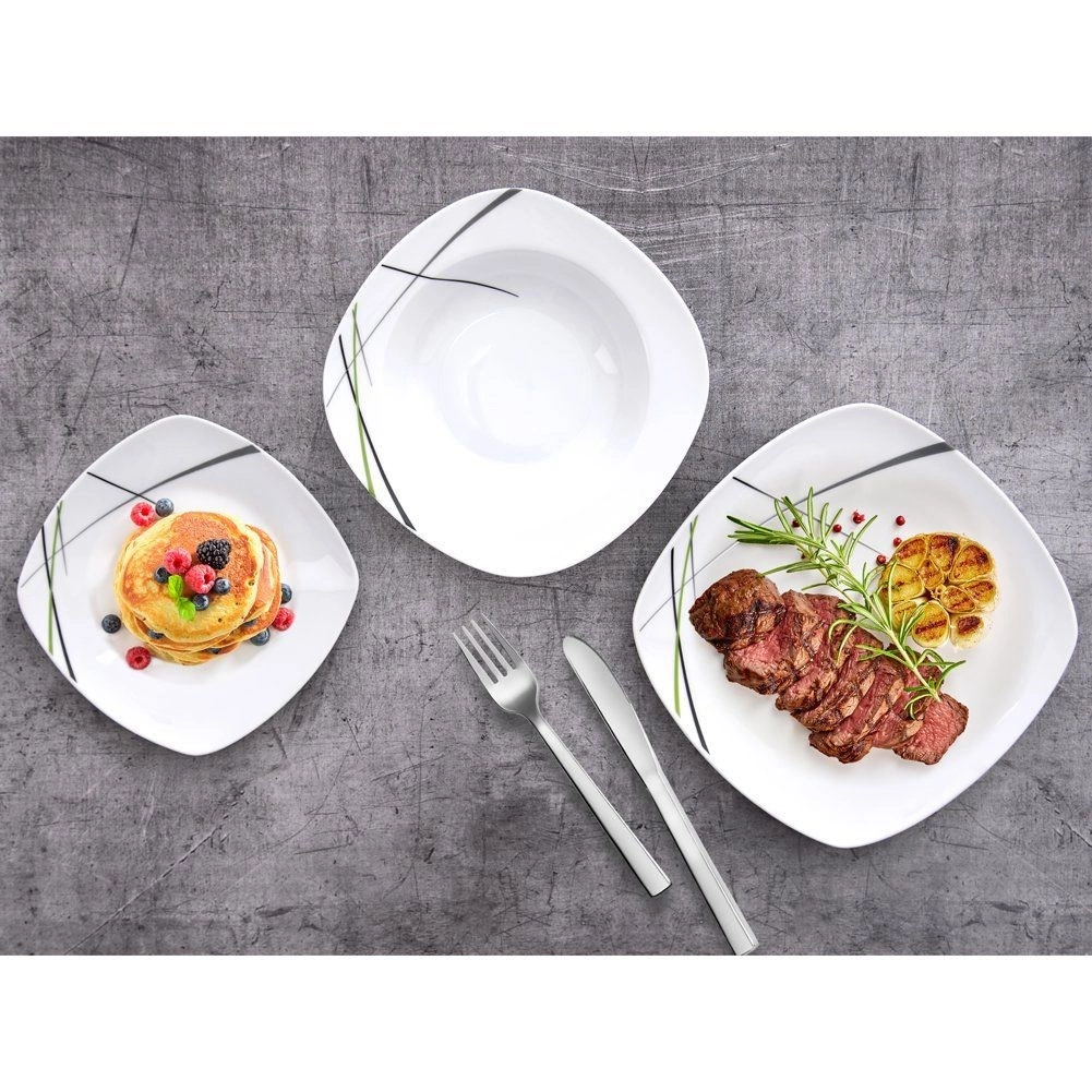 Ta kvadratni jedilni set iz kakovostnega porcelana prinaša stil in praktičnost v vsak dom. Sodobni dekor v kombinaciji zelene, črne in sive barve lepo izstopa na mizi ter ga zlahka uskladite z ostalo opremo. Je idealen za zajtrke, kosila in večerje ter odlično služi pri družinskih srečanjih in slavnostnih pogostitvah.