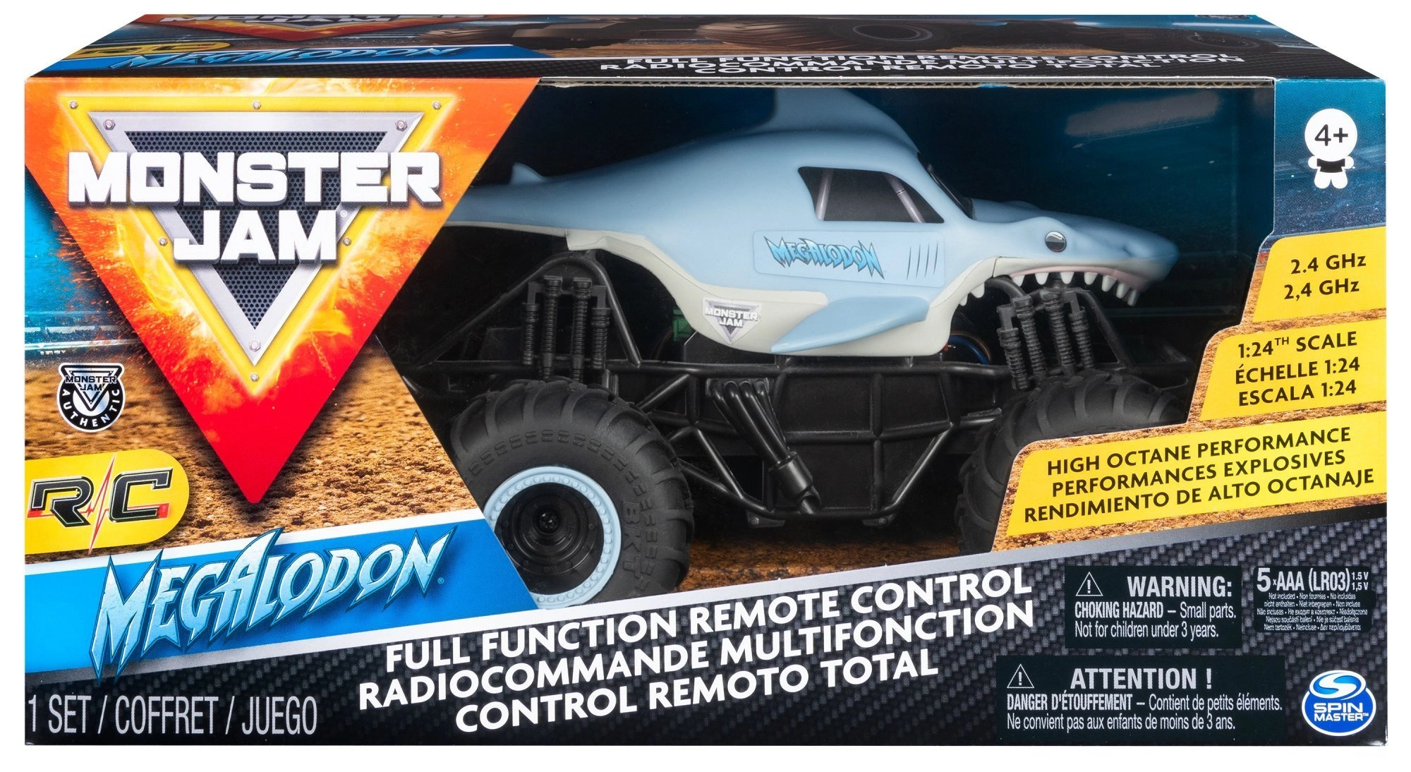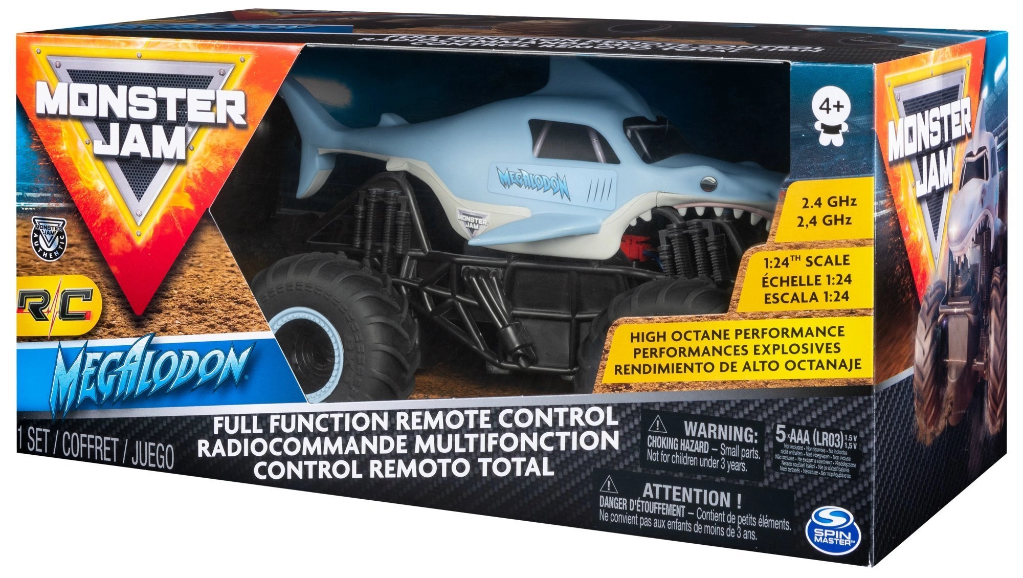 Licencirani RC avto MONSTER JAM Megalodon prinaša avtentičen videz ikoničnega monster trucka z modro karoserijo v slogu morskega psa, plavutmi in zobmi. Merilo 1:24 je idealno za domače dirke in prve RC izkušnje.