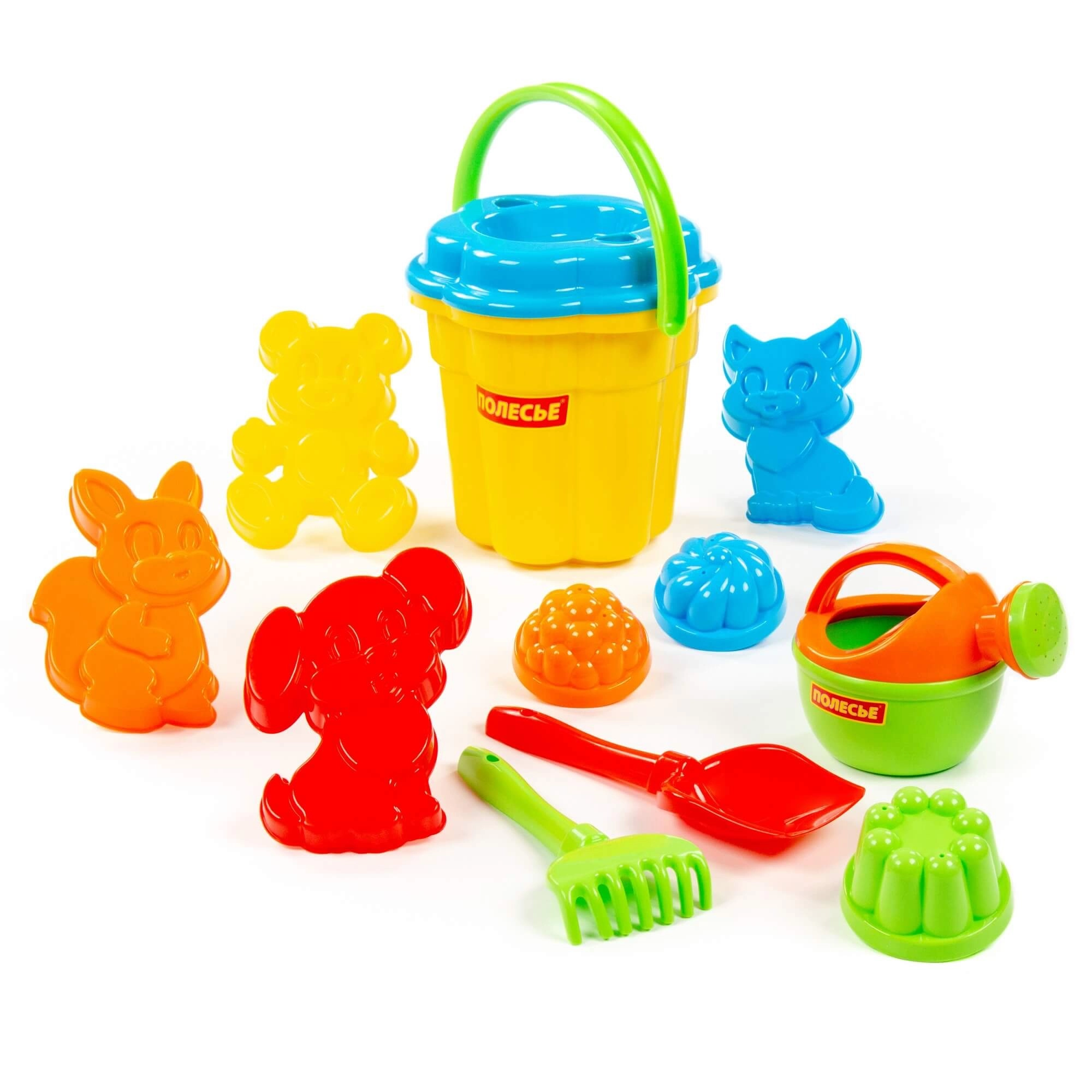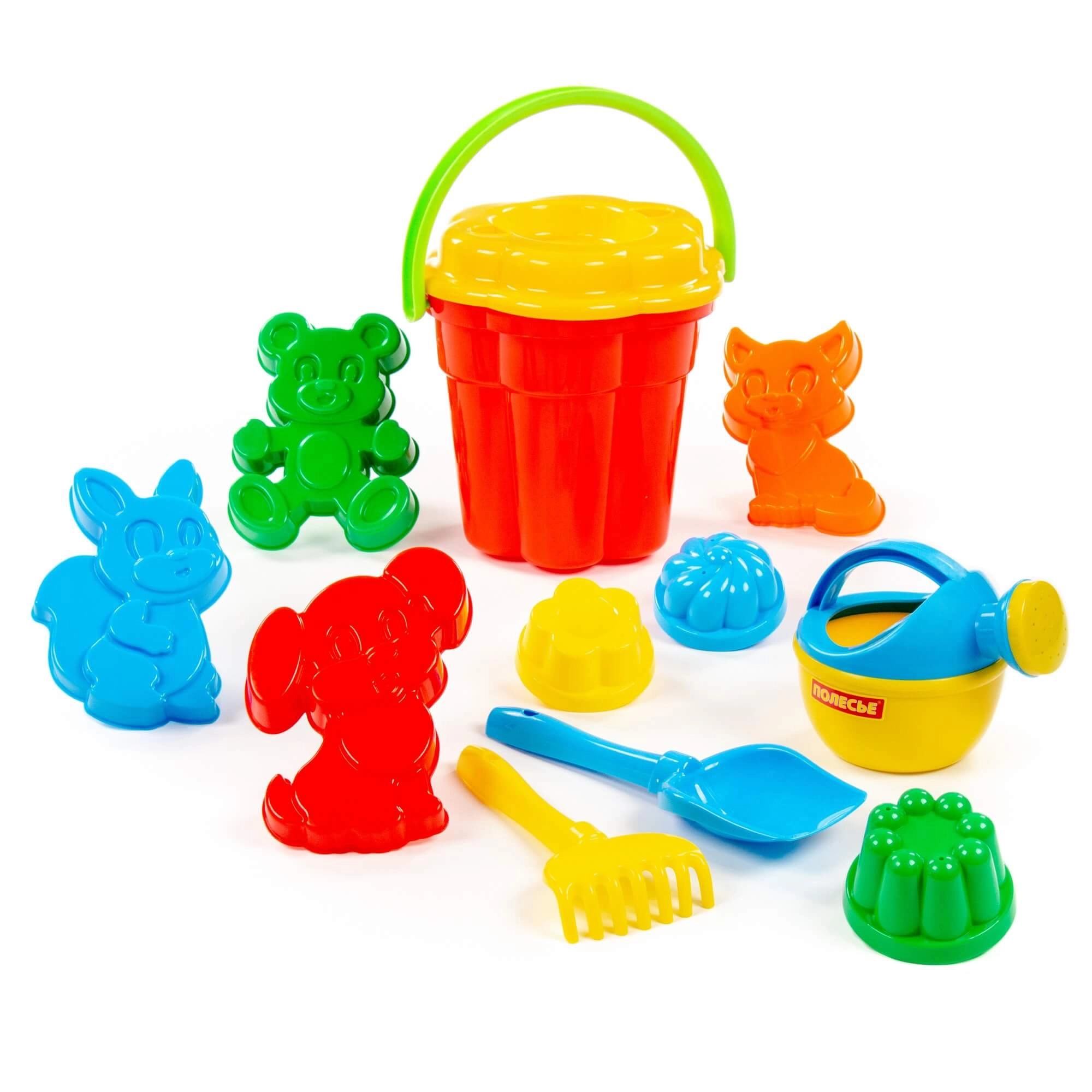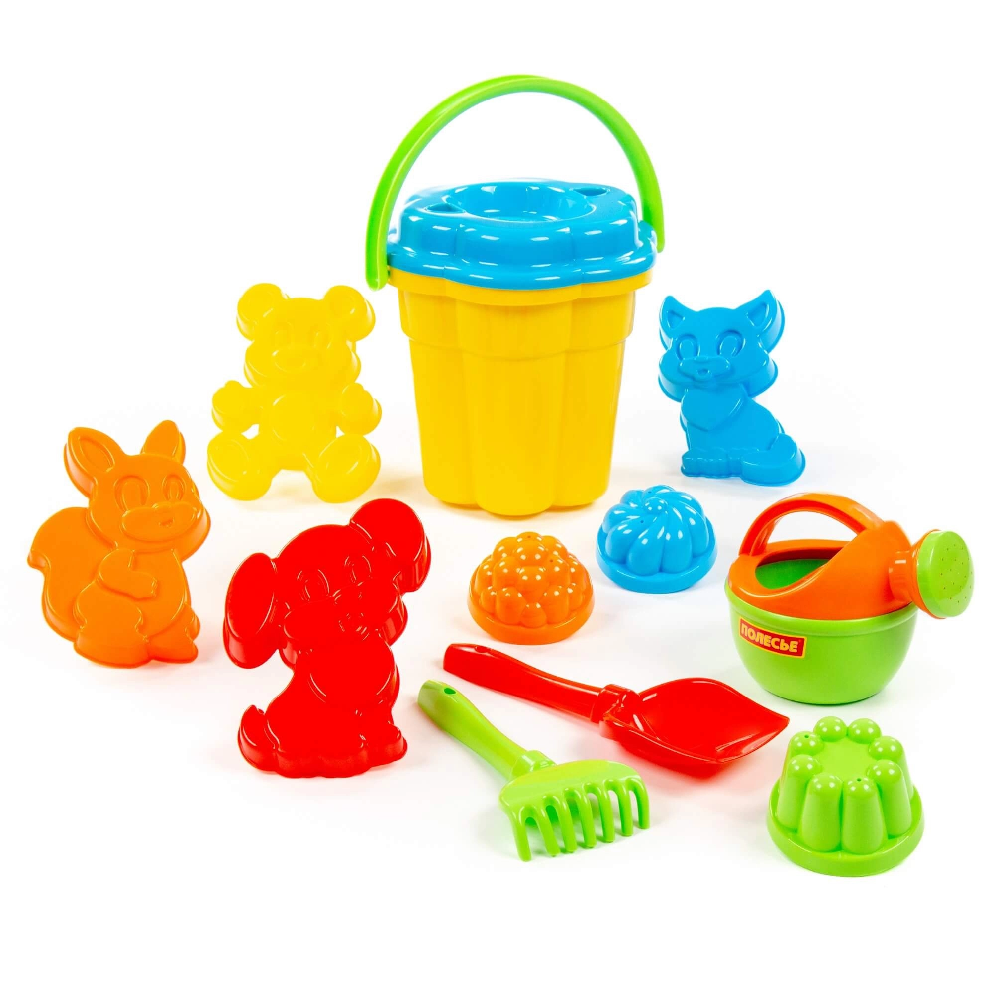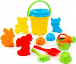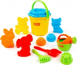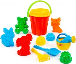 - Vedro, 4× modelček živalica, 3× modelček potička, lopatka, grabljice, zalivalka