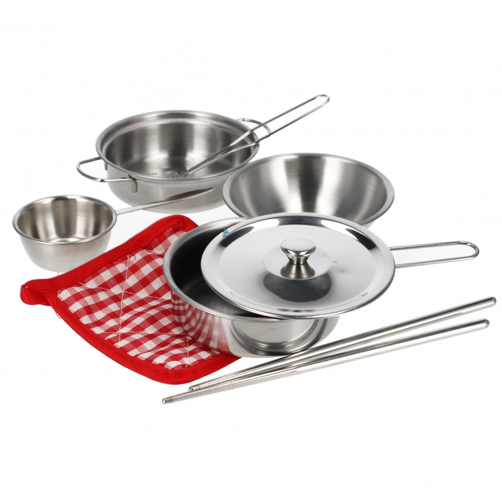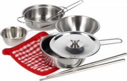 Zabaven otroški kuhinjski set za male kuharje od 3 let. Vsebuje lonce s pokrovom, skledo, zajemalko, krpo in palčke za igro kuhanja. Idealno za razvoj domišljije, fine motorike in igre vlog v otroški kuhinji.