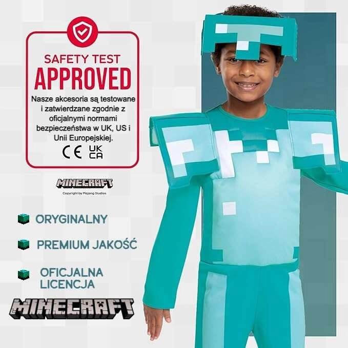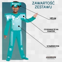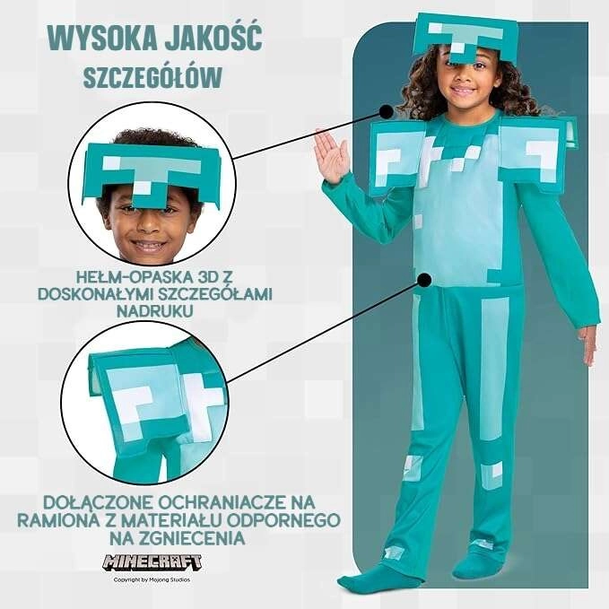 Ta uradno licenciran kostum MINECRAFT diamantni oklep spremeni otroke v junake njihove najljubše igre. Mehak pajac s potiskom pikslov in izrazitimi ramenskimi paneli dopolnjuje lahka čelada, ki kostumu doda ikoničen videz. Zahvaljujoč prijetnim materialom je kostum udoben tudi pri daljšem nošenju.