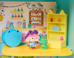 Del pakiranja so igralni elementi, ki razvijajo domišljijo in fino motoriko. Komplet je združljiv z Veliko Gabi‑jino hišico, zato ga zlahka vključite v večjo zbirko. Odlična izbira za otroke od 3 let naprej, ki obožujejo pisane like in svet mačjih prijateljev.