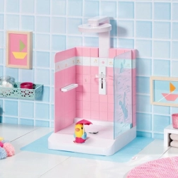 Praktično držalo za punčko varno drži dojenčka BABY born ali starejšega sorojenca na mestu, nastavljiva višina prhe pa se prilagodi obema velikostma. Priložena je tudi podloga proti škropljenju, ki ohranja okolico suho. Eleganten dizajn z rožnatimi ploščicami se odlično ujema z dodatki iz kolekcije Kopalnica.
