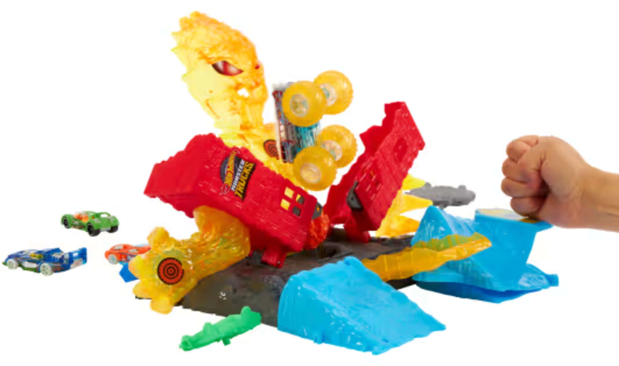 Obvladaj areno s centralnim ognjenim stolpom, vzmetnim izstreljevalnikom in interaktivnimi ovirami. Vsak natančen zadetek sproži učinkovito eksplozijo, zamah vrat ali padec delov – popolno za trening natančnosti in tekmovalno igro s prijatelji. Idealen darilni set za oboževalce HOT WHEELS in monster truckov.