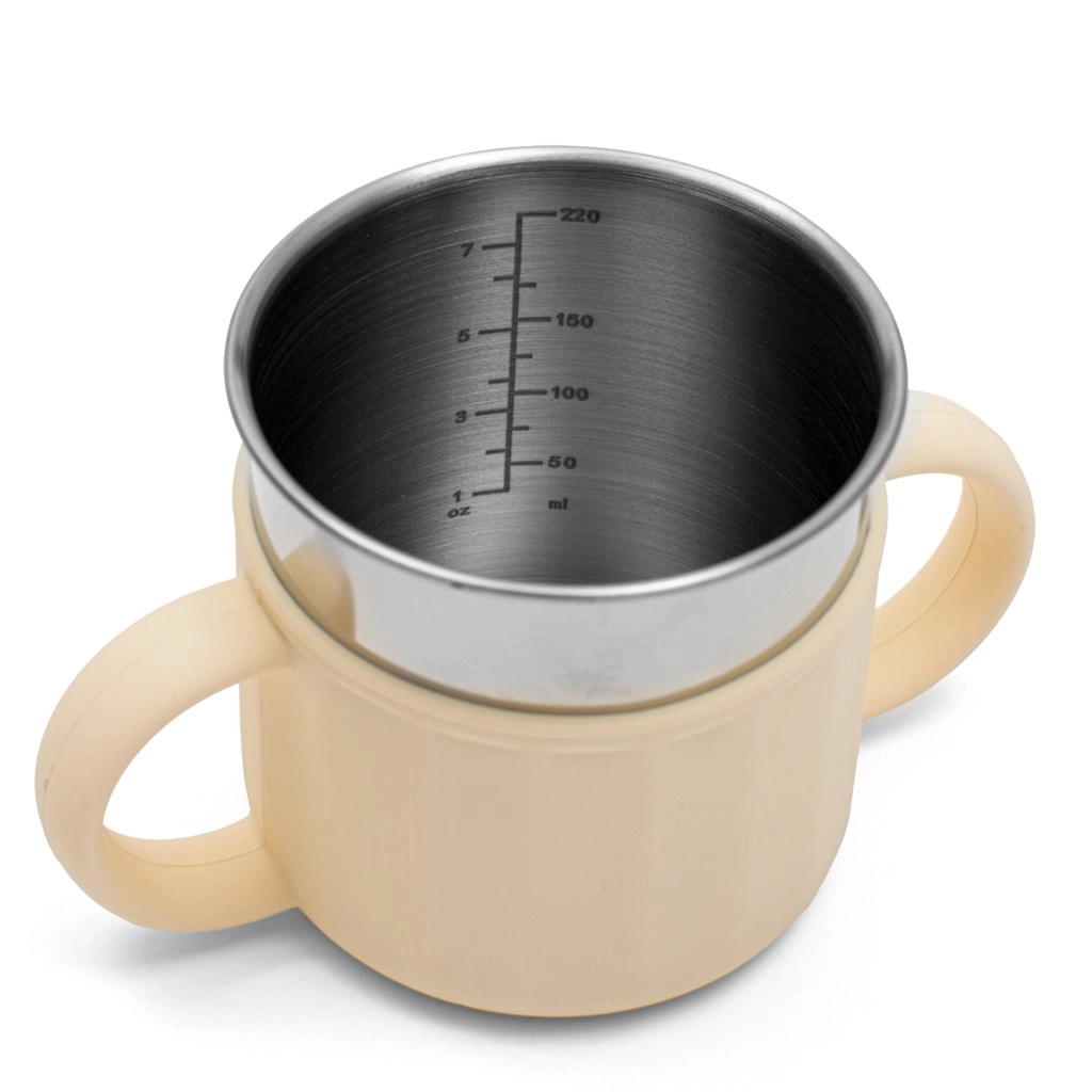 Odkrijte stilski in funkcionalni lonček 2v1 NEW BABY, ki raste z vašim otrokom. Kombinacija 50 % mehkega silikona in 50 % nerjavečega jekla zagotavlja trpežnost, higieno in enostavno čiščenje. Zahvaljujoč dvema stranskima ročajema lonček odlično leži v rokah tudi najmlajšim, prefinjen bež dizajn pa se poda v vsak interier.