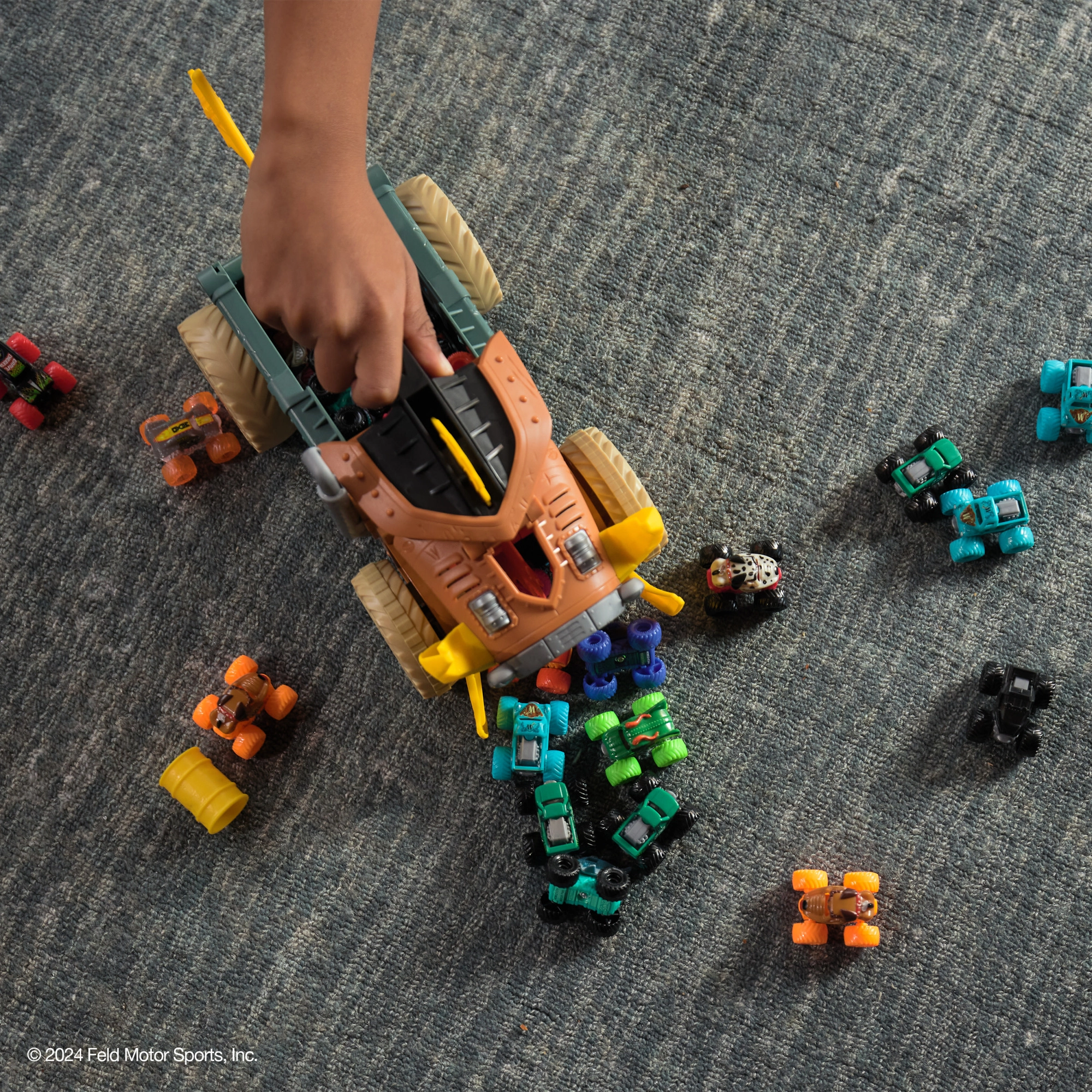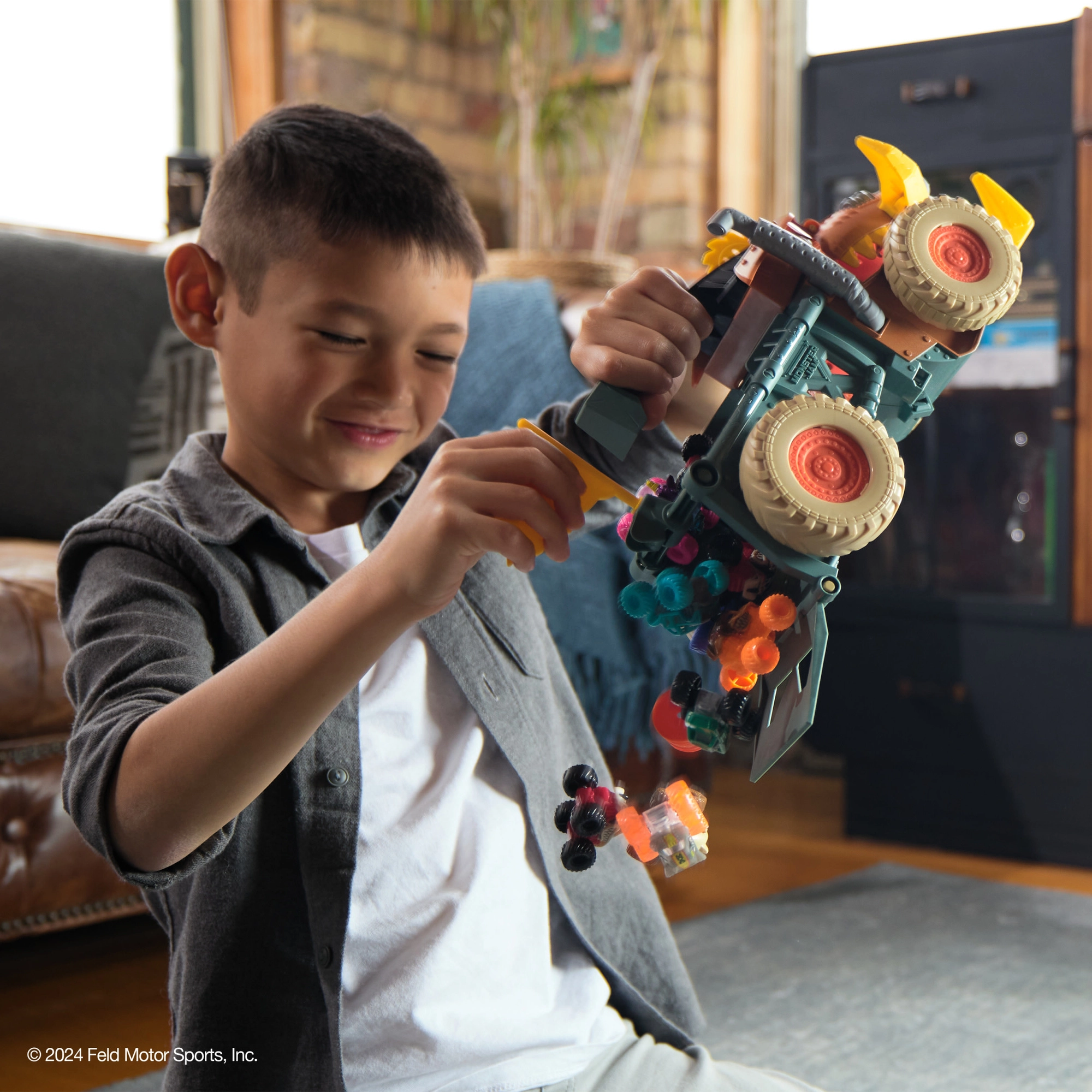 Veliki Mad Hog Chomper z odpirajočimi se »usti« in robustnimi kolesi zlahka pobira mini tovornjak Megalodon in dodatke. Otroci bodo uživali v akcijski igri, pri kateri lahko vozila zbirajo, prevažajo in shranjujejo neposredno v Chomperju – odličen način za spodbujanje reda po igranju.
