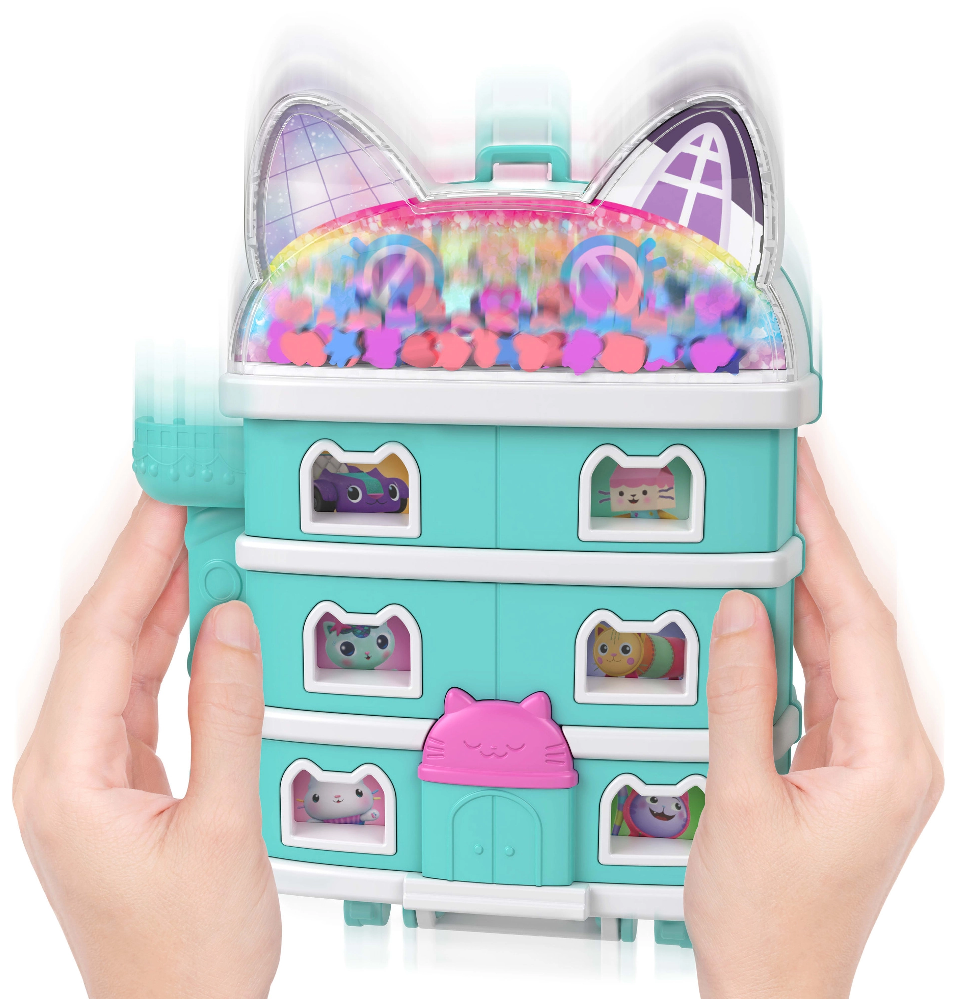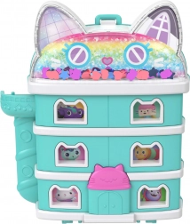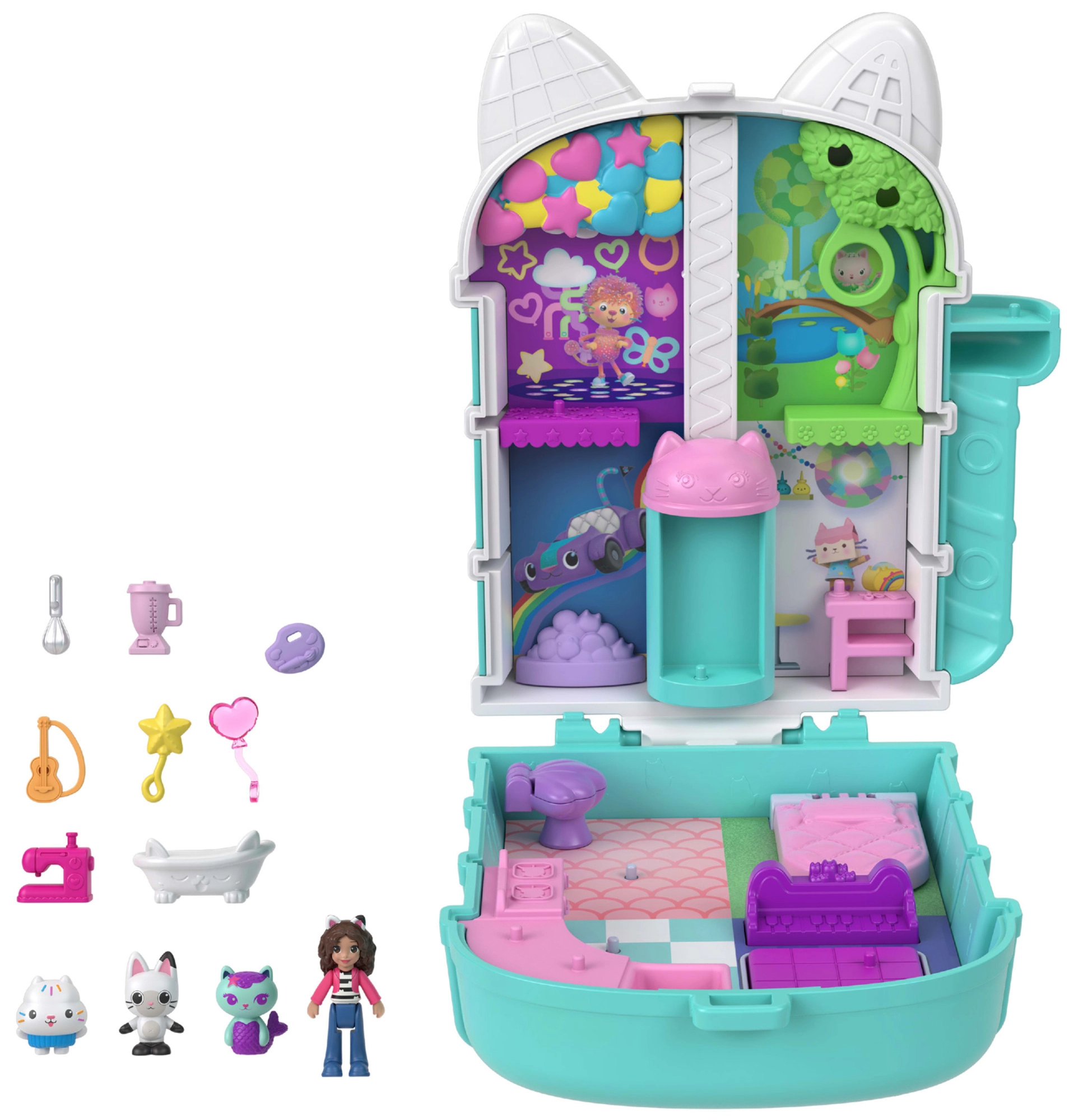 Odkrijte čarobni svet v žepni velikosti s kompaktnim setom Polly Pocket, navdihnjenim po seriji GABBY’S DOLLHOUSE. Prisrčen mačji domek z ročajem ponuja več prostorov, funkcionalno dvigalo, bleščečo kupolo in obilico interaktivnih dodatkov za neskončno igro doma ali na poti.
