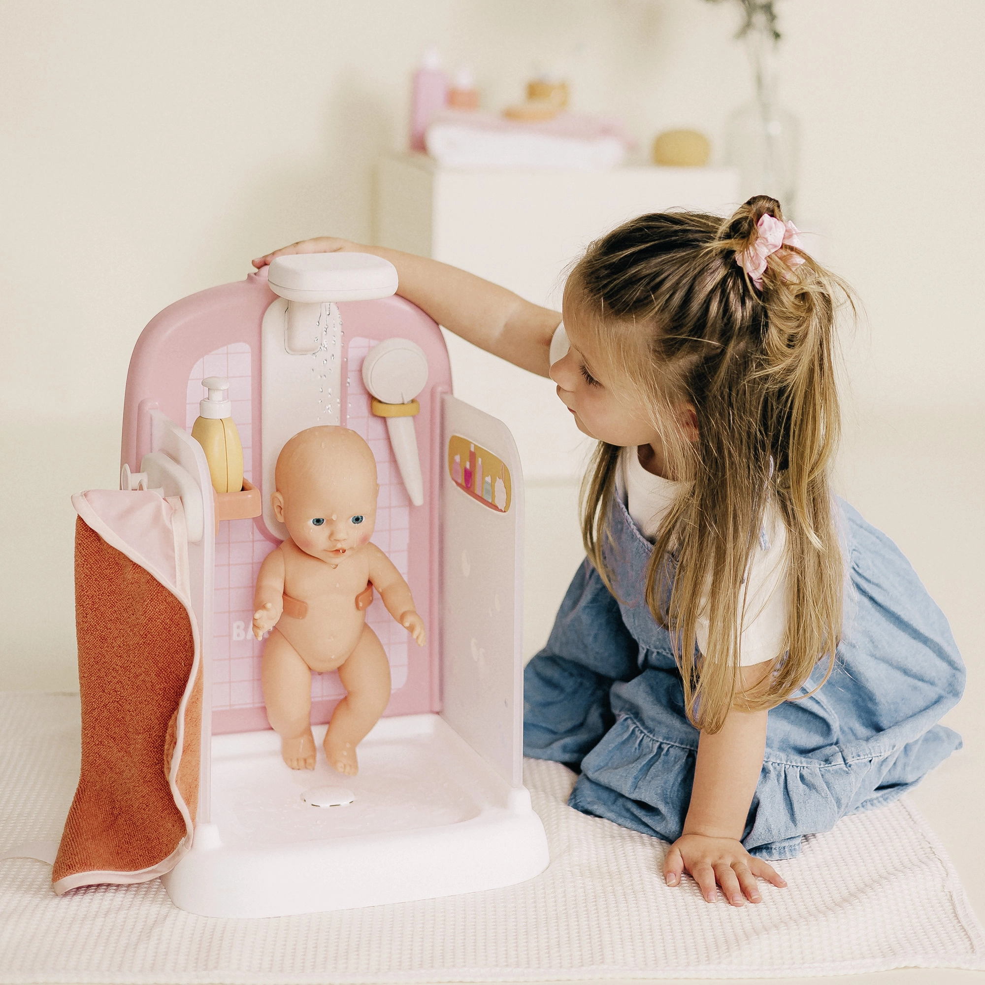 Odkrijte realistično nego punčke z elegantno rožnato-belo tuš kabino BABY NURSE. Ob pritisku na gumb začne iz tuša teči voda, zato lahko otroci punčko resnično »okopljejo« in jo nato zavijejo v mehko brisačo s kapuco. Zahvaljujoč praktičnemu držalu lahko punčka pod tušem sama stoji, otroci pa imajo proste roke za umivanje in izpiranje.