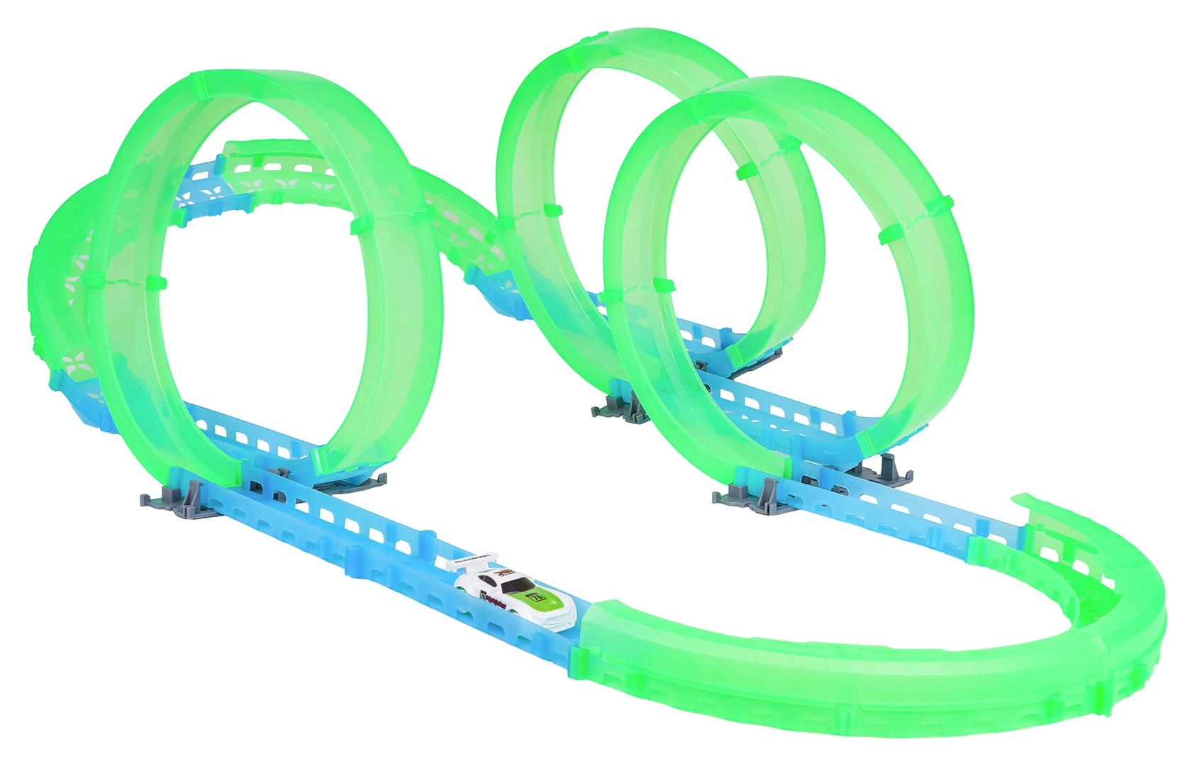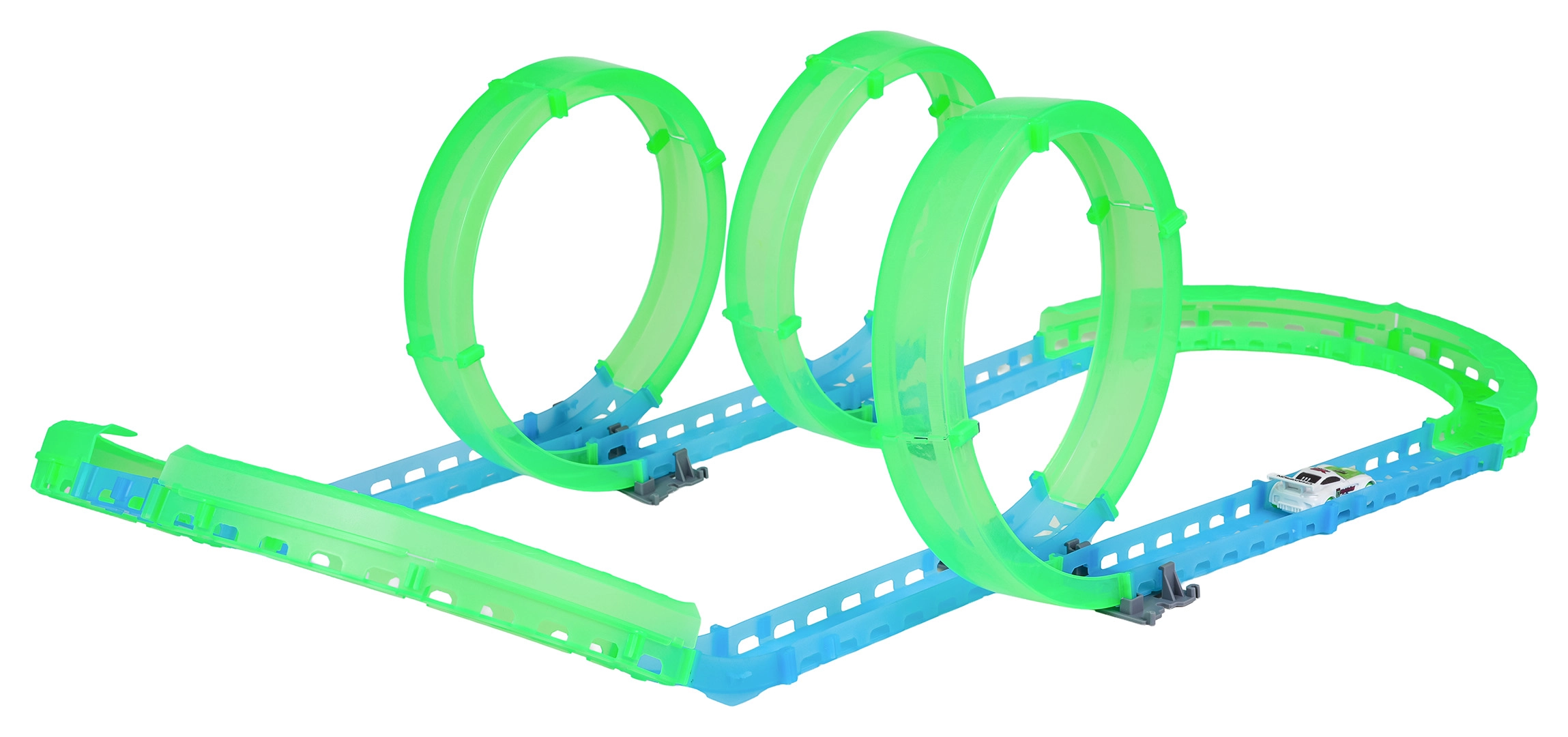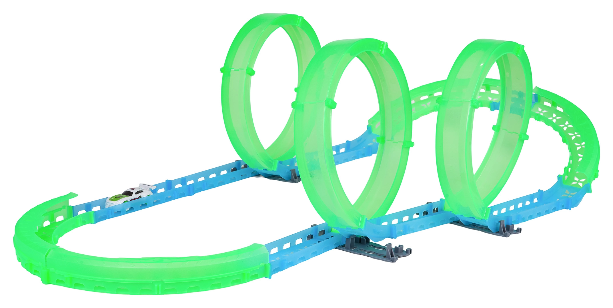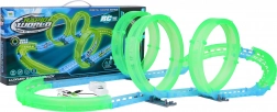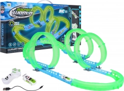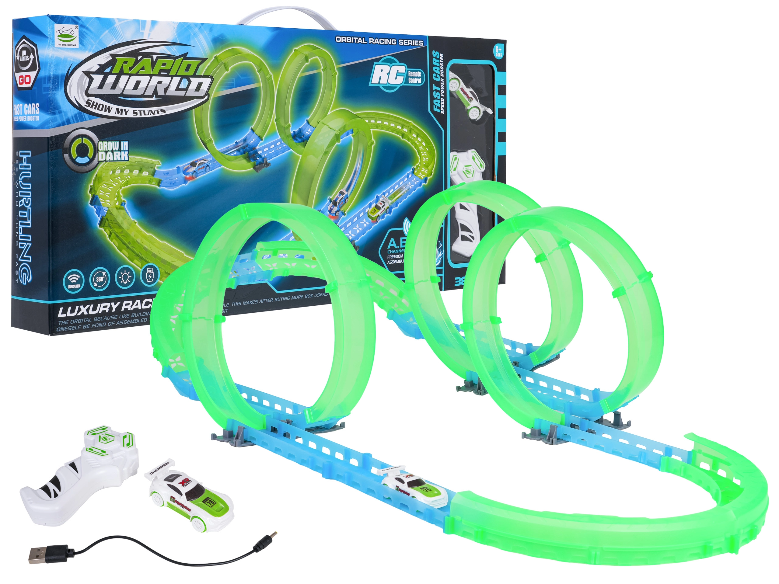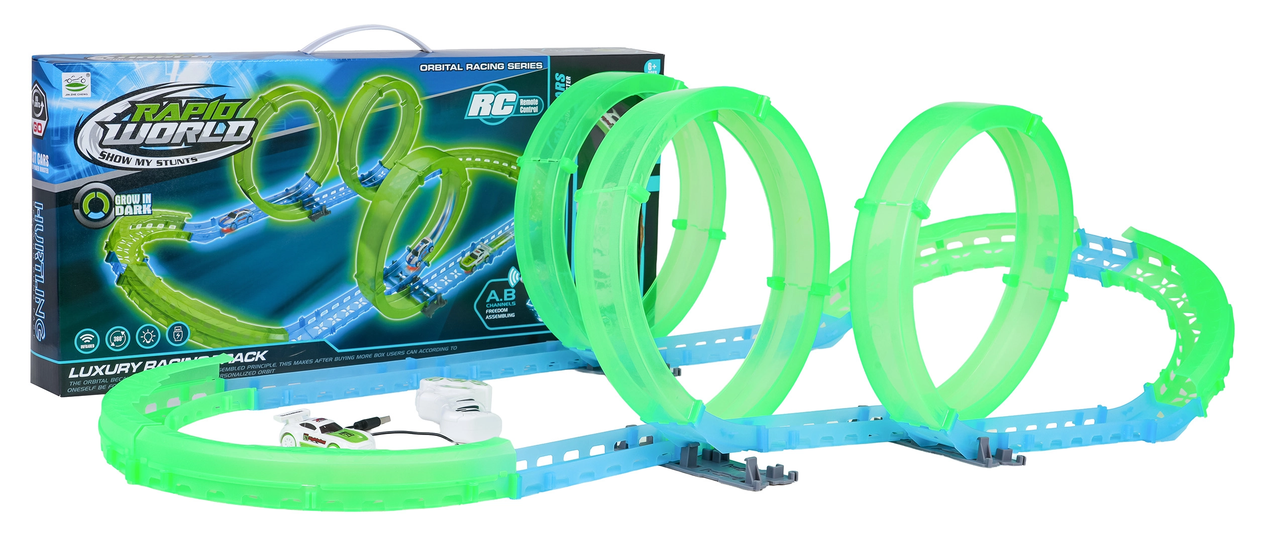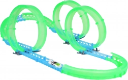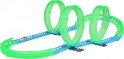 Zgradite svojo akrobatsko stezo in uživajte v vožnji tudi po temi. Fluorescentni elementi svetijo v temi, majhen RC avtomobilček pa se pelje naprej po pripravljeni progi. Zahvaljujoč LED osvetlitvi med vožnjo ustvarja efektne svetlobne sledi.