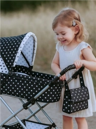 Elegantni retro voziček za punčke 2v1 New Baby Natalka v belo‑črnem pikčastem dizajnu združuje globoko košaro in športno različico. Ponuja nastavljiv ročaj, vzmeteno kovinsko ogrodje, lahka gumijasta kolesa ter bogat nabor dodatkov, vključno s torbo in nakupovalno košaro. Odlična izbira za ustvarjalno igro in vsakodnevne sprehode z najljubšo punčko.