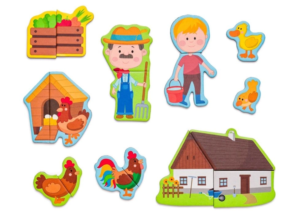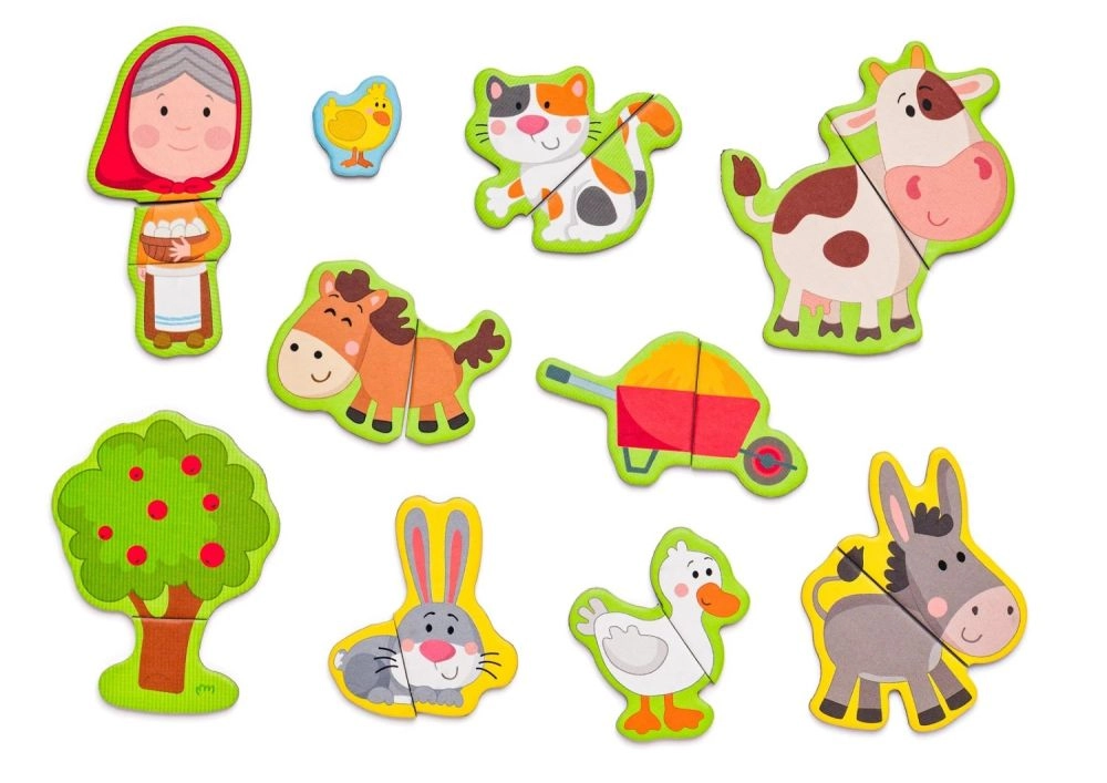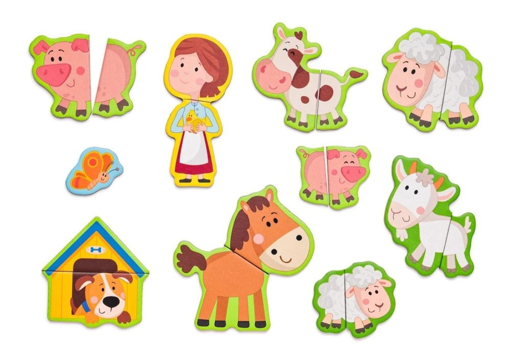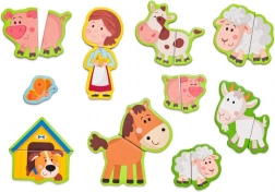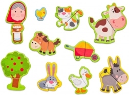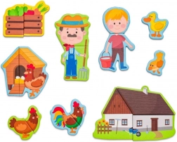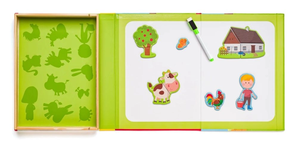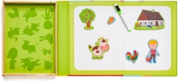 Ta magnetni set s kmečko tematiko prinaša otrokom ure ustvarjalne zabave. Odprta lesena škatla služi kot magnetna tabla, na katero je mogoče pritrditi barvite dele z liki, živalmi in dodatki. Otroci sestavljajo svoje zgodbe, spoznavajo živali in vadijo koordinacijo oko–roka.