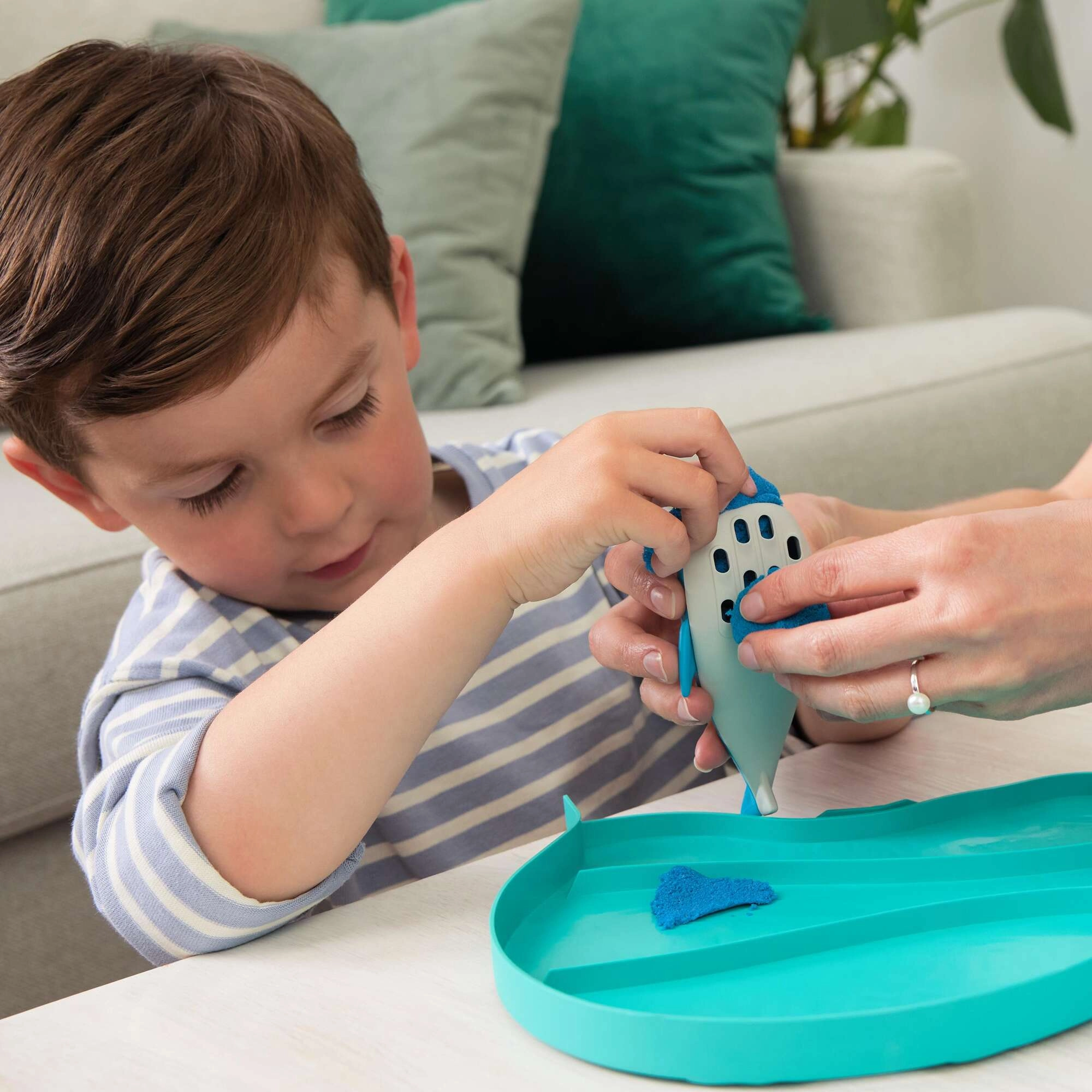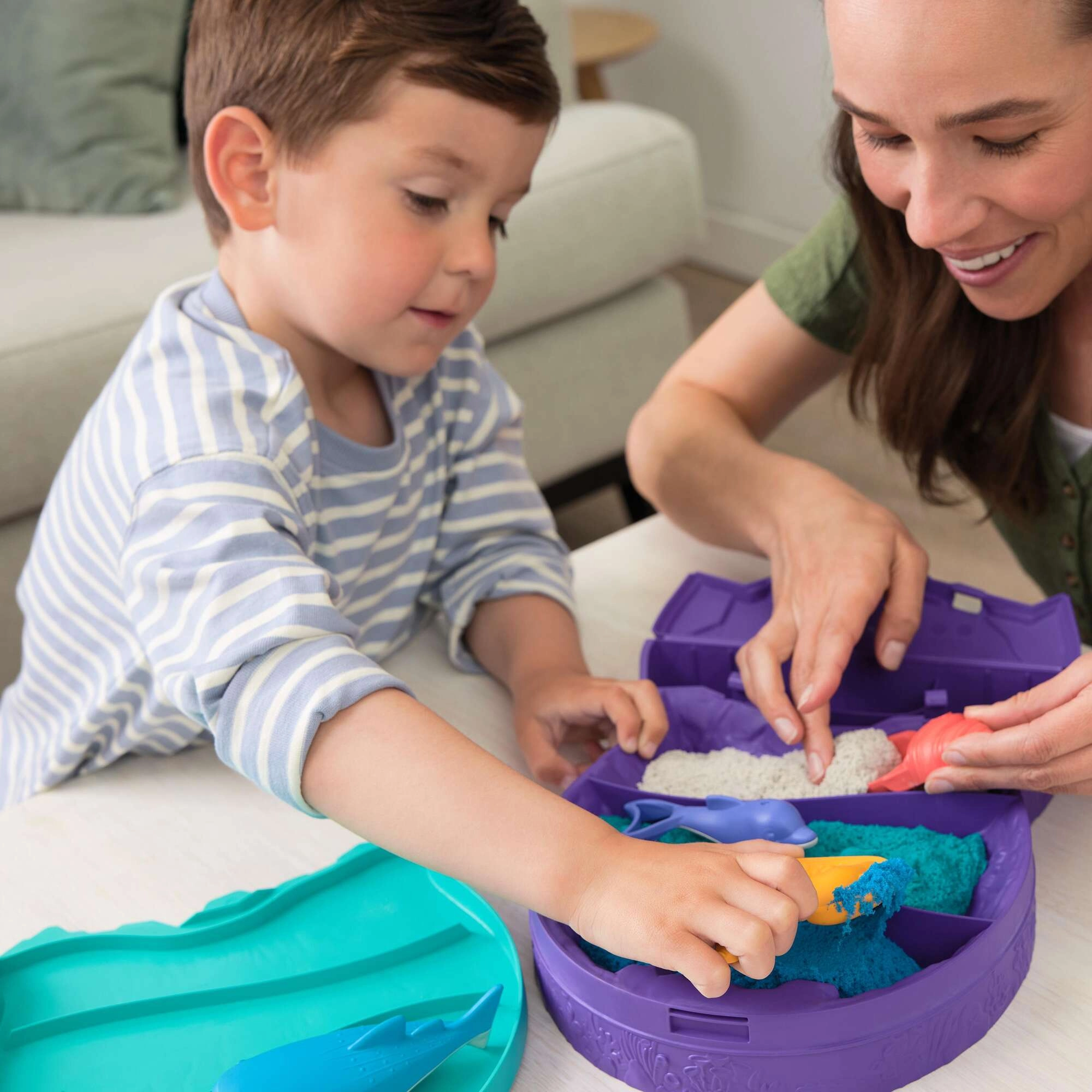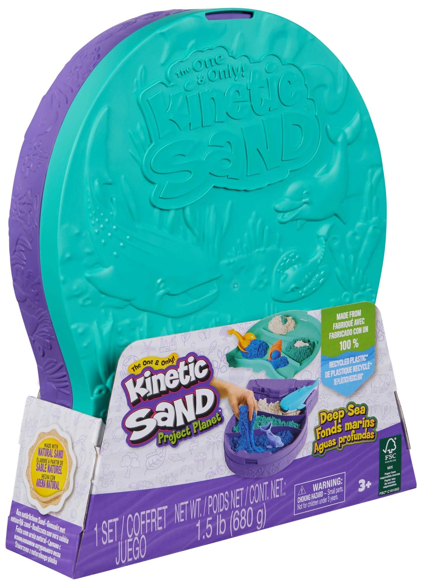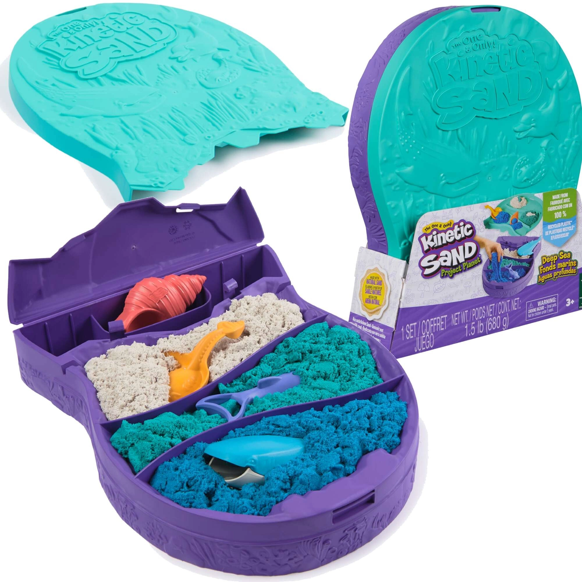 Kinetični pesek Kinetic Sand posnema občutek mokrega peska, vendar brez umazanije in izsuševanja. Otroci lahko zlahka oblikujejo, režejo, stiskajo in gradijo, medtem ko urijo koordinacijo in ustvarjalnost. Set Deep Sea ponuja kombinacijo modre, bele in zelene za ustvarjanje zabavnih podmorskih prizorov in oblik.