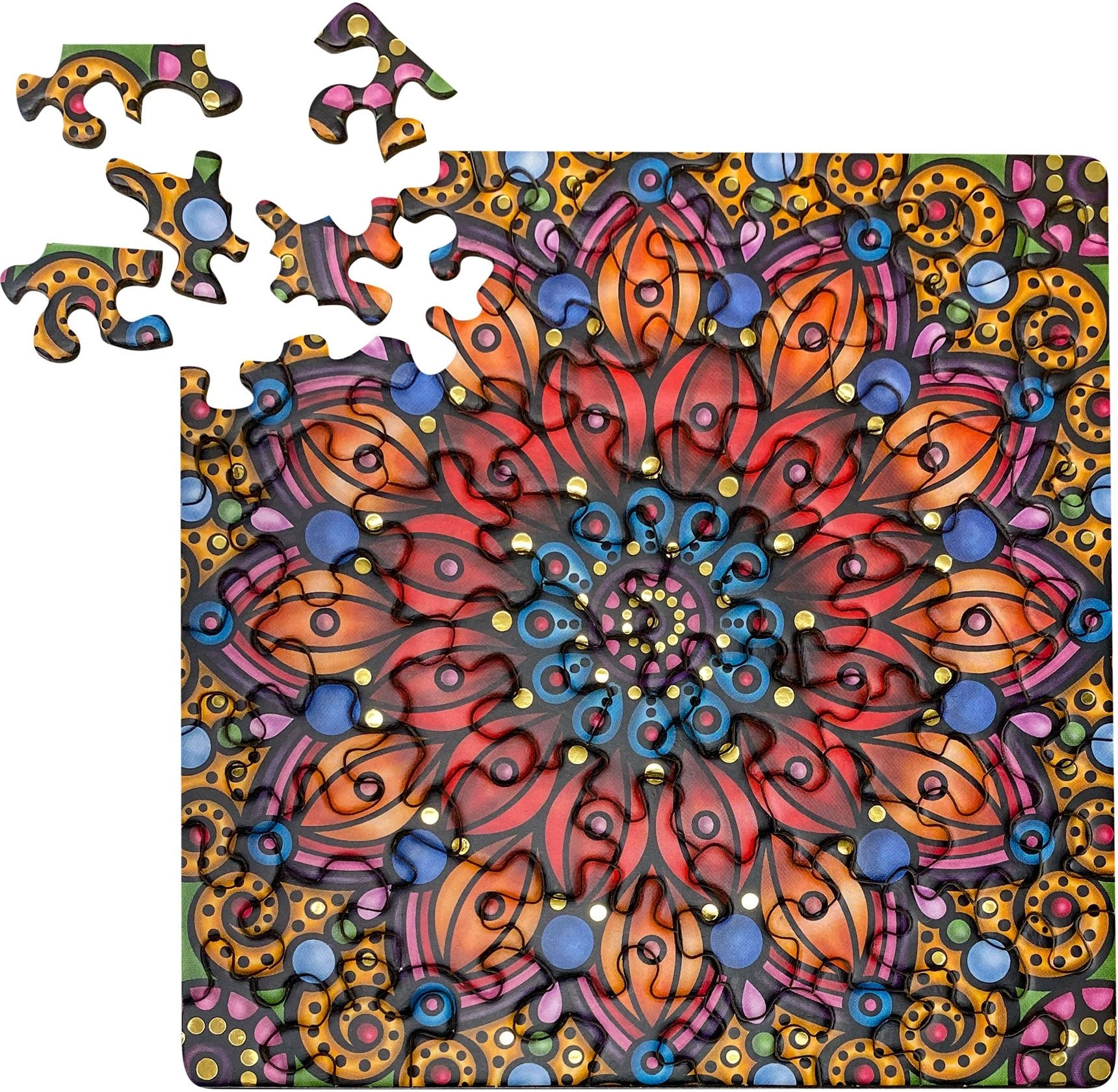 Ta kvadratna sestavljanka bo navdušila vsakogar, ki obožuje izzive v malem formatu. Zahvaljujoč netradicionalnim oblikam koščkov je sestavljanje zabavno in vizualno privlačno, medtem ko zlati lesk končni sliki doda pridih razkošja.