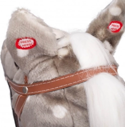 Po pritisku na uho konjiček premika gobček in predvaja pesmico Prší, prší v češčini ali slovaščini. Odlično za zabavo in razvoj slušnega zaznavanja.