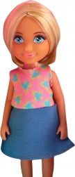 - Punčka z blond lasmi v krilu in topu s srčki.