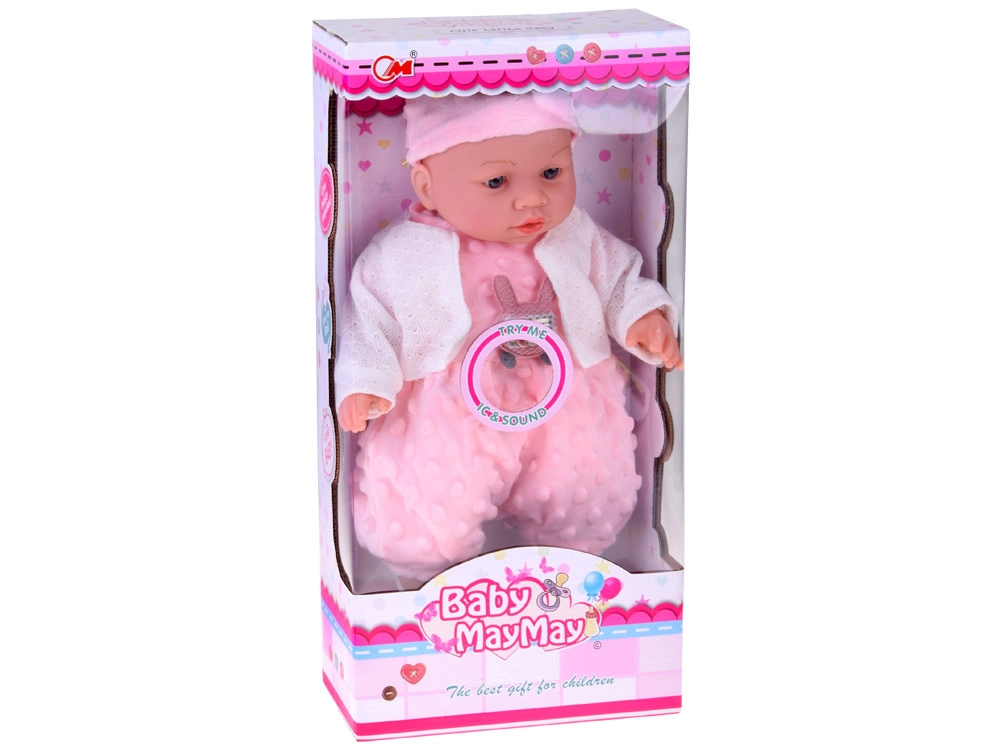 Zvočni modul je skrit v trebuščku – ob pritisku se oglasi mešanica zvokov, ki jih otroci obožujejo: blebetanje, smeh, godrnjanje in jok. Punčka nima las in drobnih delov, zato je varna za najmlajše. V pakiranju je priložena baterija, dovolj je le odstraniti varovalo in igra se lahko začne.