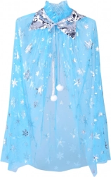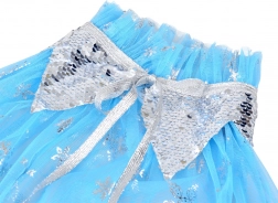 Eleganten plašč iz lahkega, prosojnega tila je okrašen s srebrnimi snežinkami in bleščičastim ovratnikom. Zavezovanje z mehkima belima cofoma zagotavlja udobno in varno nošenje. Hladni modri toni s srebrnim leskom ustvarjajo očarljiv zimski videz, ki ga imajo otroci radi.