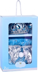 V kompletu je tudi celoten set nakita: plastična krona z modrimi “dragulji”, ogrlica s kapljičastim obeskom, izrazit prstan in klips uhani s srčastimi kamni. Vse je lahko, udobno in prilagojeno za otroško preoblačenje.