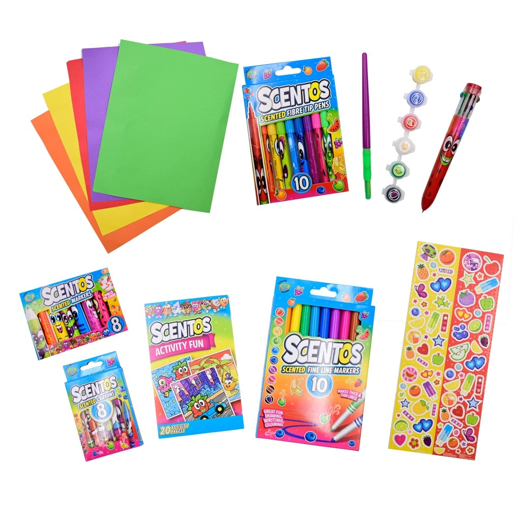 - 10 dišečih flomastrov s tanko konico, 10 flomastrov z vlaknasto konico, 8 dišečih barvic, 8 voščenk, paleta 6 tempernih barv, majhen čopič, tematske nalepke, barvni listi papirja (5 barv)
