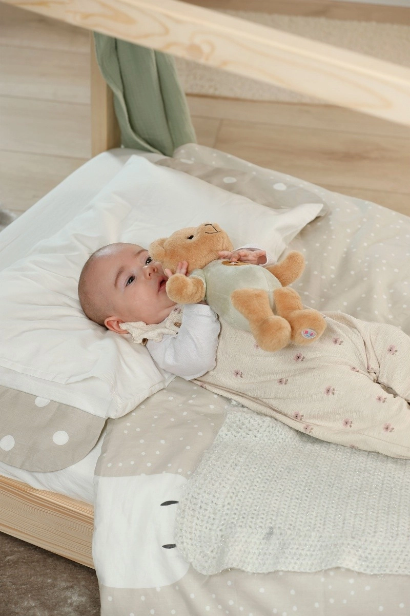 Plišasti medvedek BABY born Teddy je zasnovan za najmanjše ročice – lahek, mehak in popolnoma privlačen za crkljanje. Zaradi kompaktne velikosti 26 cm ga otroci zlahka primejo in držijo pri uspavanju ali čez dan. Harmonični pastelni odtenki delujejo pomirjujoče in se lepo podajo v otroško sobico.