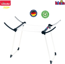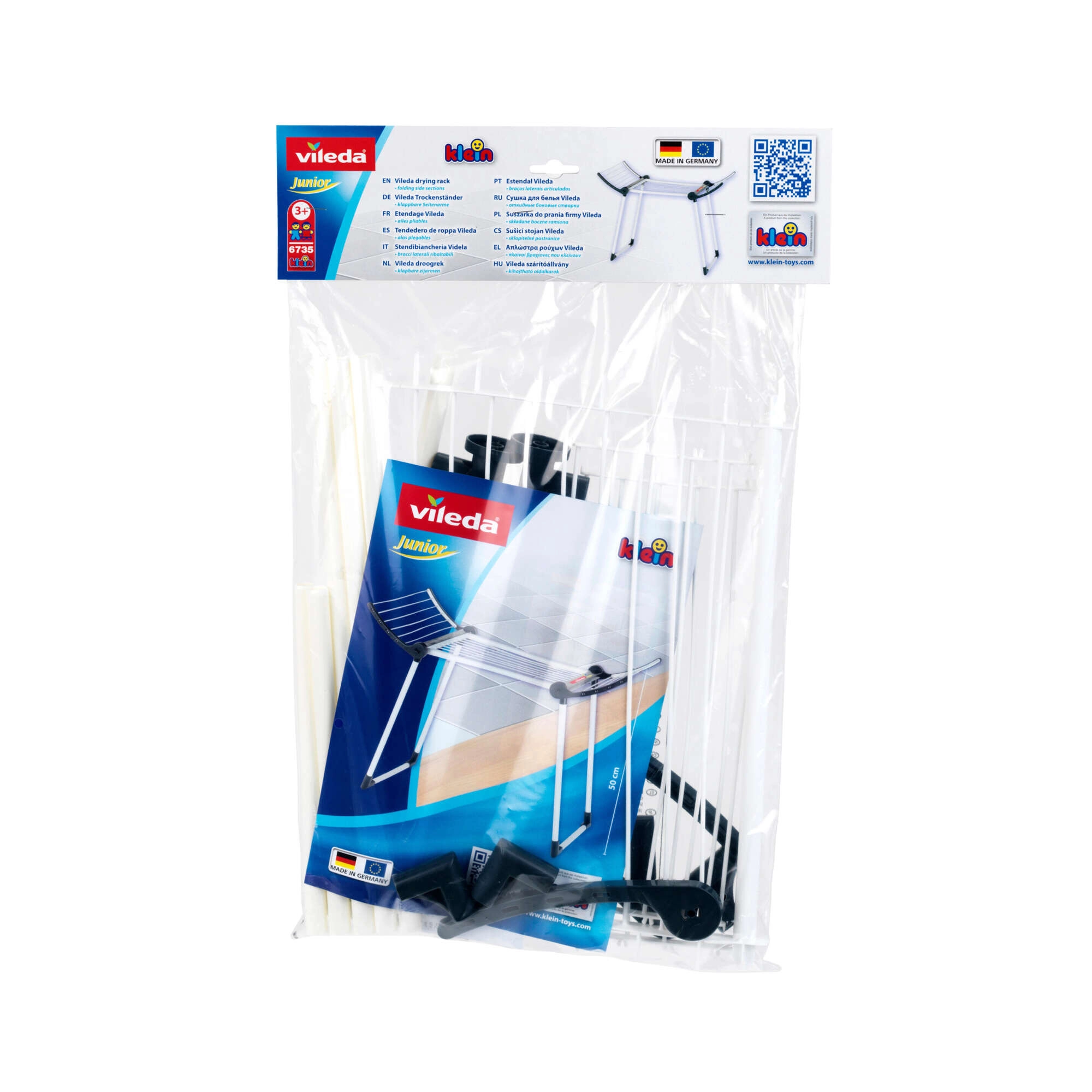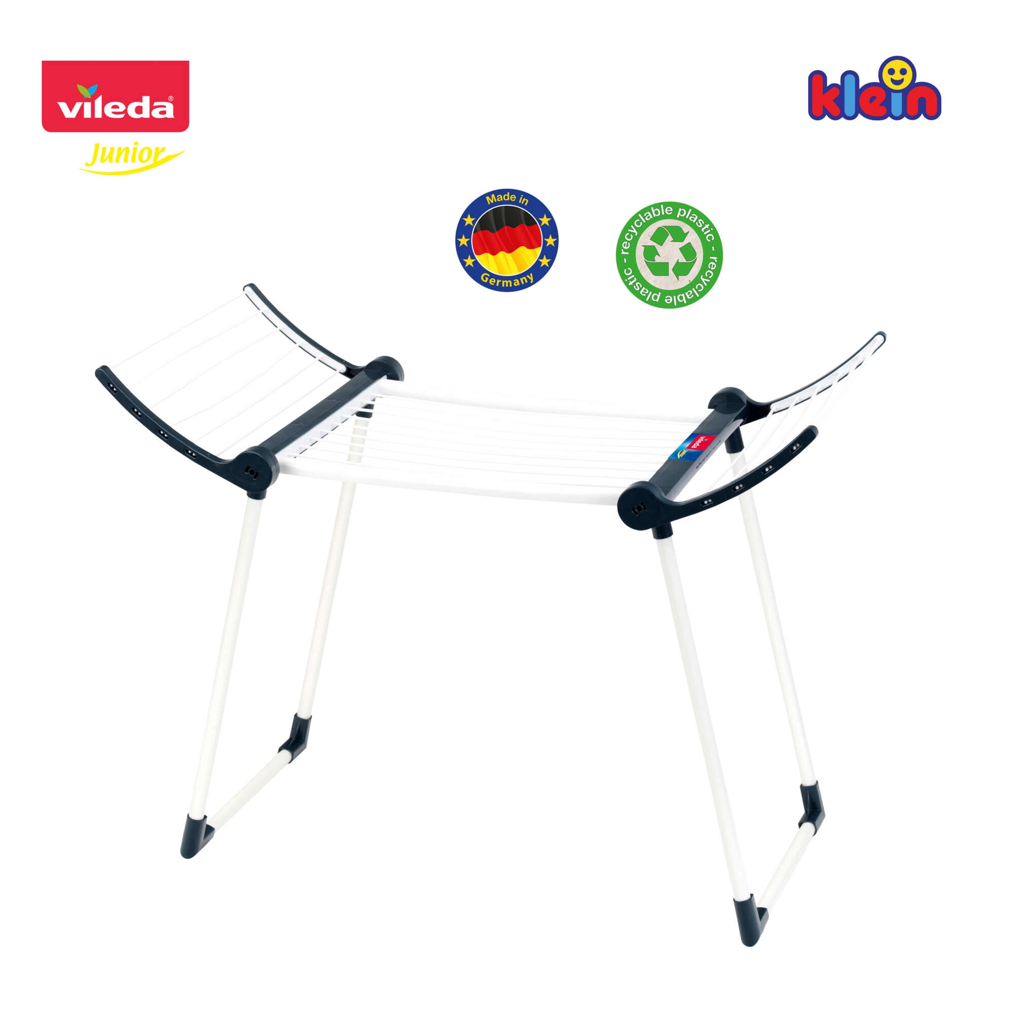 Realistično otroško stojalo za sušenje perila Vileda znamke KLEIN je zvesta kopija pravega sušilnika in otrokom ponuja varno ter zabavno posnemanje domačih opravil. Izdelano je z poudarkom na detajlih, ima stabilna dvojna stojala, dve zložljivi stranski krili in nizko težo. Zahvaljujoč možnosti zlaganja na manjše dimenzije ne zavzema prostora, ko ni v uporabi.