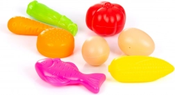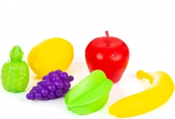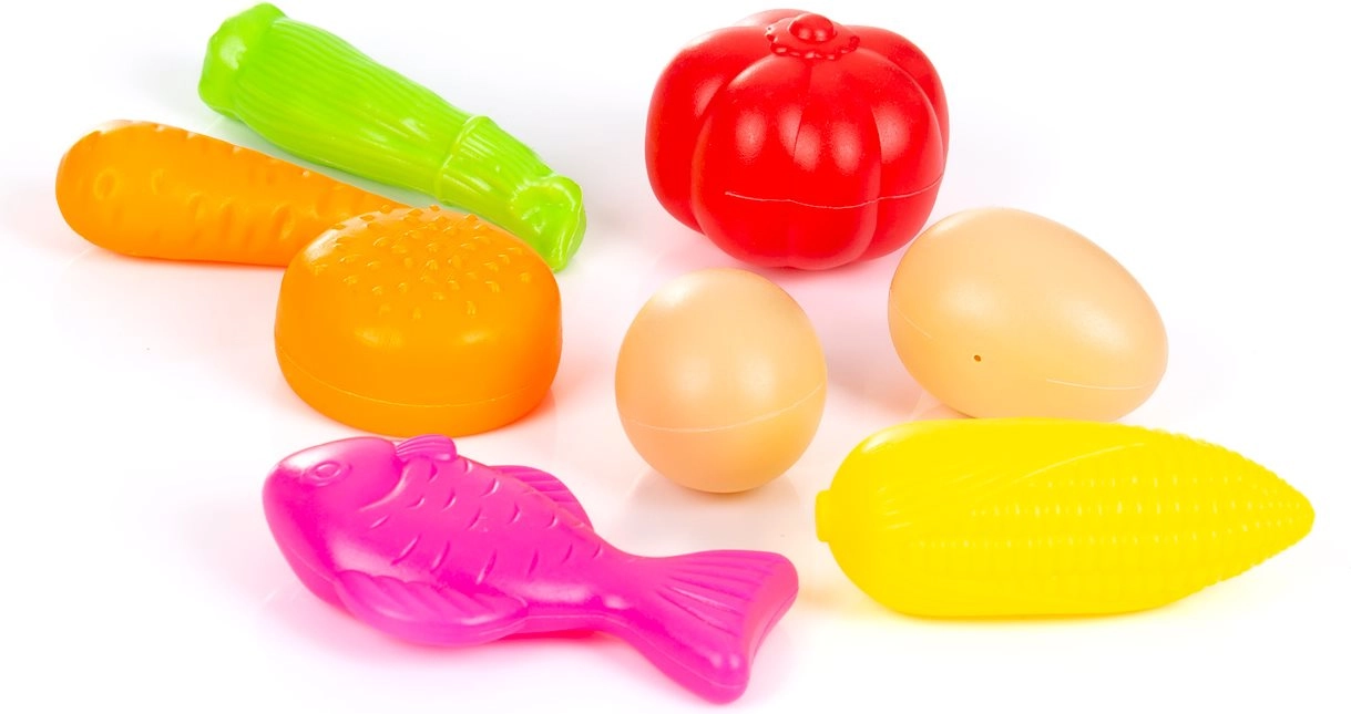 Set vsebuje realistične makete sadja in zelenjave v živih barvah, ki pomagajo pri prepoznavanju oblik in spodbujajo ustvarjalno igro vlog.