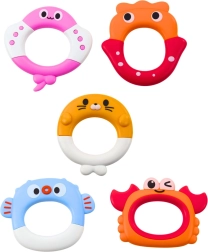 Zamenljivi obročki različnih barv in oblik spodbujajo prijem, koordinacijo ter odkrivanje novih kombinacij igre.