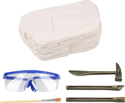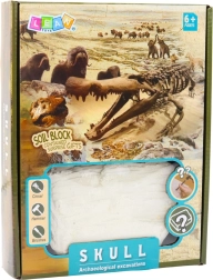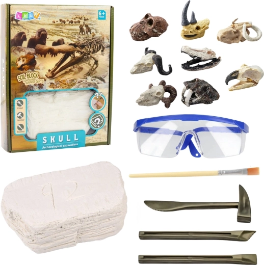 Ta arheološki komplet otrokom omogoča doživeti prave »izkope«. V notranjosti vzdržljivega mavčnega bloka je skrita skrivnostna lobanja – lahko pripada različnim prazgodovinskim bitjem, zato je vsako odkritje edinstveno. S pomočjo dlet/sekal, kladivca in čopiča bodo otroci preizkusili, kako previdno odkrivati najdbo, jo čistiti in raziskovati detajle.