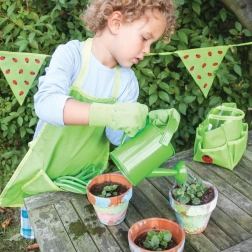 Zalivalka s čvrsto šobo ter zgornjim in stranskim ročajem dobro sede v majhne roke in omogoča natančno zalivanje brez polivanja. Elastični zapestni deli rokavic preprečujejo vdor nečistoč in držijo rokavice varno na mestu. Set vsebuje 6 kosov in je popolno darilo za otroke od 3 let dalje.