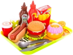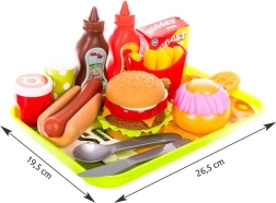 Zabaven komplet za male kuharje z do 26 barvnimi deli za igro na fast food. Vsebuje pladenj, hamburger, hot dog, pomfrit, vafelj, pijače in omake. Spodbuja domišljijo, fino motoriko in skupno igro s starši.