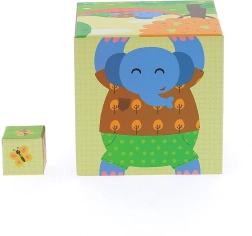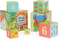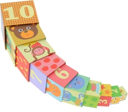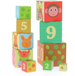 Odkrijte igriv komplet 10 kartonskih kock z lepimi ilustracijami živali, ki otroke učijo štejanja, prepoznavanja barv in živali. Pri gradnji stolpov razvijajo fino motoriko in koordinacijo. Ekološko izdelane in lahke kocke so idealne za preprosto zlaganje in vstavljanje ena v drugo.