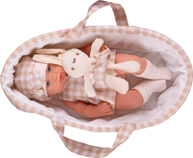 Ljubka punčka velikosti 33 cm s trdim telescem in realističnimi detajli bo razveselila vsakega malega skrbnika. Ima odprte oči, nežno priprt usta in je usklajena v elegantnih bež tonih. Priloženi sta nosilka in plišasti zajček za razvoj empatije in domišljije. Dobavljena v darilni škatli, idealno kot darilo.