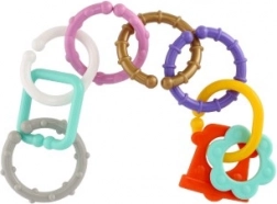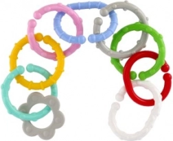 Obročki in oblike se preprosto povezujejo in trdno držijo skupaj, tako da lahko otroci ustvarjajo verižice ali pripnejo igračke na voziček ali avtosedež.