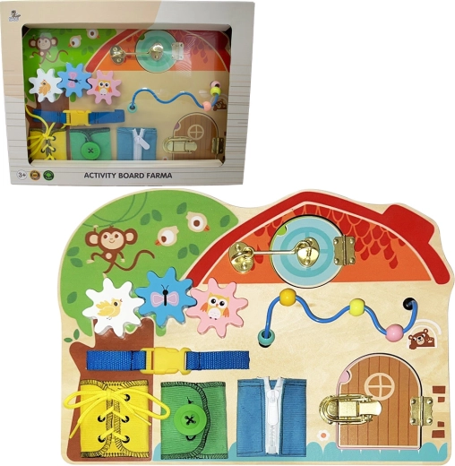 Aktivna plošča z veselimi motivi kmetije otrokom prinaša naravno učenje skozi igro. Živalice, kmečko orodje in različni interaktivni elementi vabijo k raziskovanju, urijo prstke in spodbujajo osredotočenost. Robustna lesena izdelava je prijetna na dotik in prenese vsakodnevno uporabo.