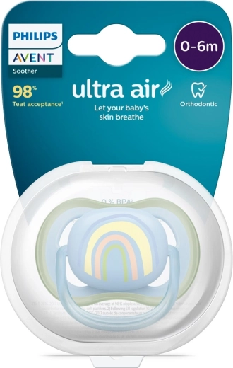 Duda Philips Avent Ultra Air je zasnovana za nežno pomirjanje in največje udobje občutljive otroške kože. Velike prezračevalne odprtine omogočajo prosto kroženje zraka, zato je koža manj vlažna in ostaja mirna. Ortodontska, simetrična silikonska cuclja je mehka, nevtralnega okusa in podpira naravni razvoj ustne votline.